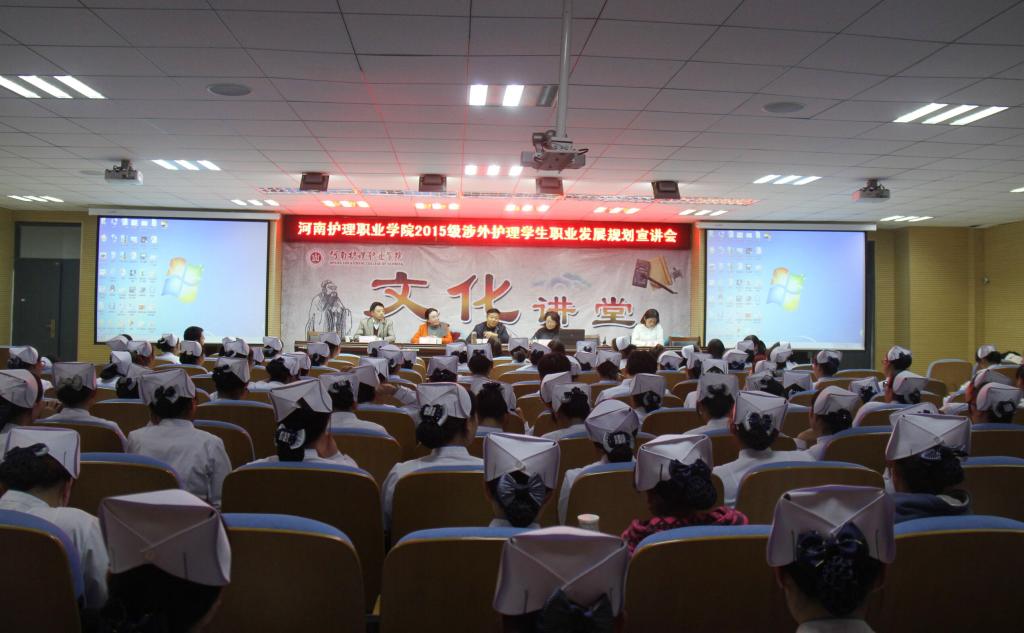 11月15日下午,星空XK体育2015级涉外护理学生职业发展规划宣讲会在学院学术报告厅隆重举行。院长郭茂华、郑州国际交流专修学院院长沈玉霞、护理系主任何敏、护理系党总支书记王昆仑、护理系副主任骆焕丽出席会议。涉外教研室全体教师、2014级涉外护理学生代表、2015级涉外护理全体学生现场参会,2016级涉外护理学生在教室观看转播。会议由护理系党总支书记王昆仑主持。