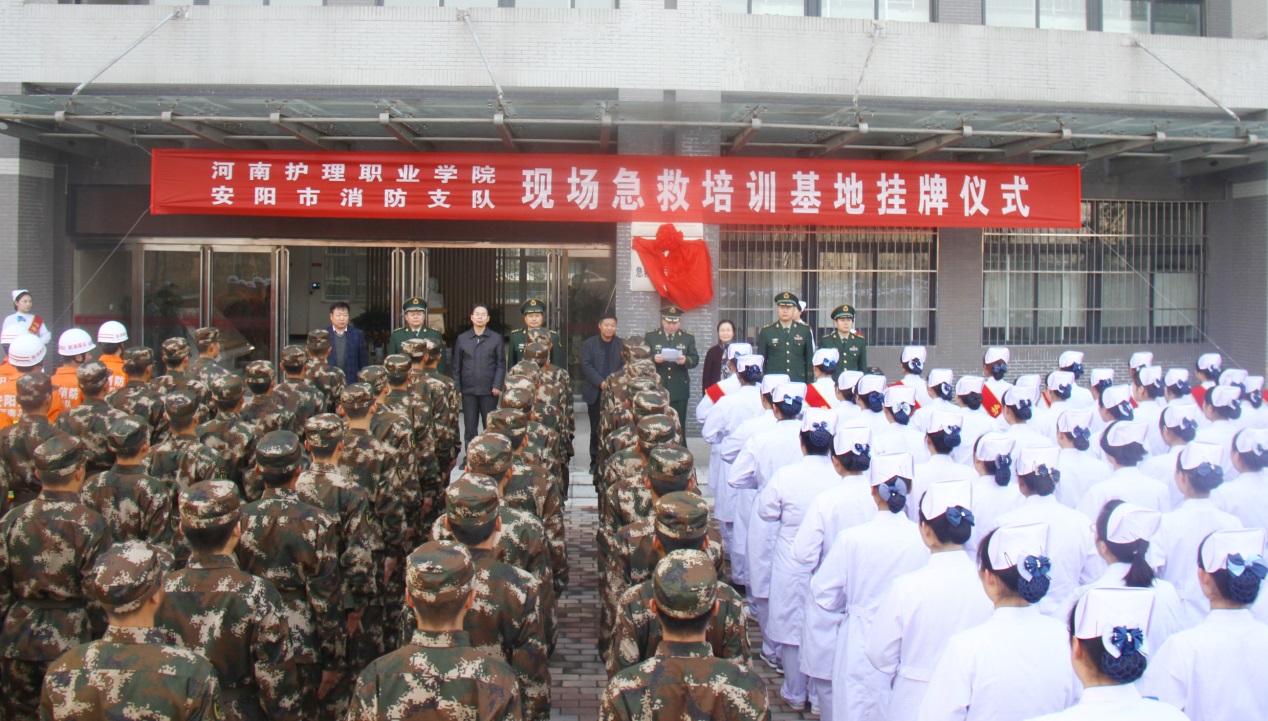 为进一步提高安阳市消防救援队伍专业化水平,提升消防官兵应急处置能力,合力推动“平安安阳”建设。11月23日下午,“安阳消防急救技能培训基地”正式落户星空XK体育,院长郭茂华和安阳市消防支队政委耿军共同为基地揭牌。安阳市消防支队吕军支队长、赵辉副支队长、余晓雷参谋长、夏长天处长及学院钟会亮副院长、张淑爱副院长出席基地揭牌仪式,安阳市消防官兵、学院师生共300余人参加仪式。揭牌仪式由学院王家桥副院长主持。