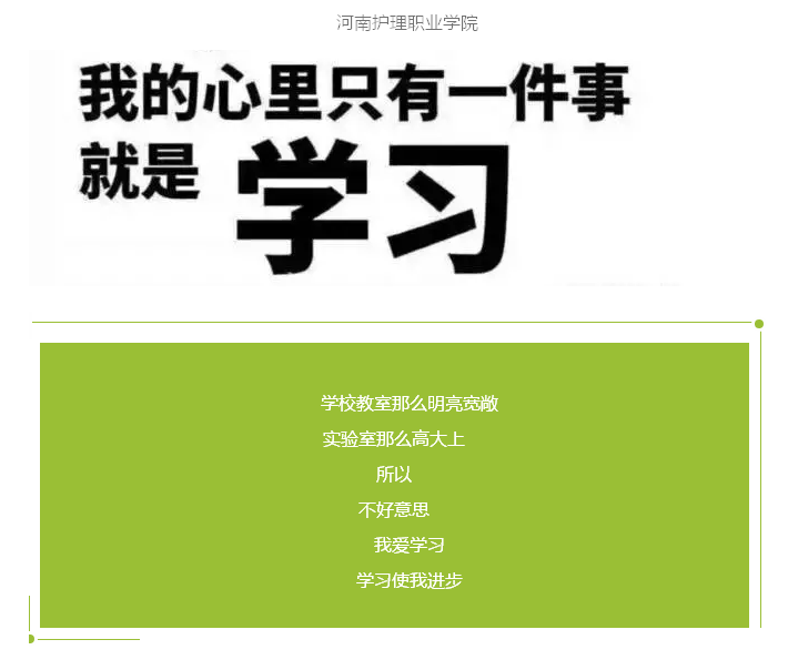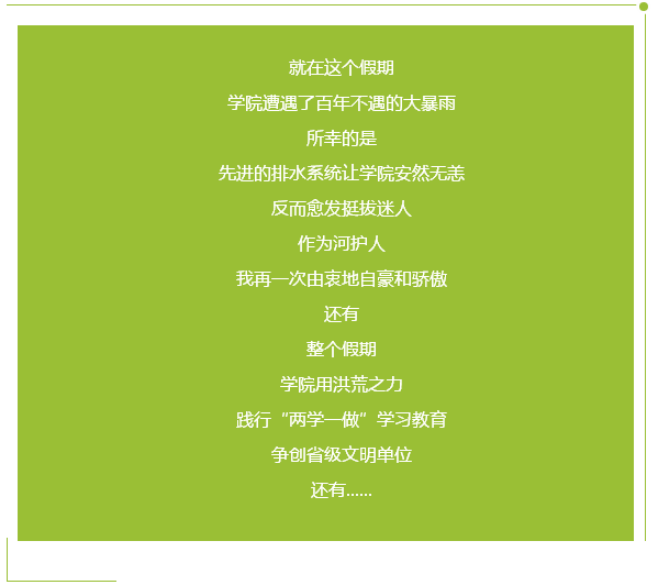 优秀作品《快!开!学!啦!》(http://mp.weixin.qq.com/s/QyRPVztyw6upd-0Ko4lPcA)是在2016年秋季开学之际,面向全体师生推送的一期微信。微信以一名学生的口吻,赞扬了学院领导班子在建设新校区时安装最先进的排水系统的高瞻远瞩和果断决策,继而在假期间抵御了安阳百年不遇的大暴雨。同时,文章还赞扬了在假期内坚守岗位努力践行“两学一做”学习教育,为省级文明单位创建付出努力的全体师生,字里行间中深深表达了一名学生渴望早日返校,努力学习的内心期盼。文章寥寥数语,但却聚焦了中国特色社会主义和中国梦宣传教育,推动了社会主义核心价值观培育践行,体现了立德树人基本导向,弘扬了主旋律,传播了正能量,成效明显。