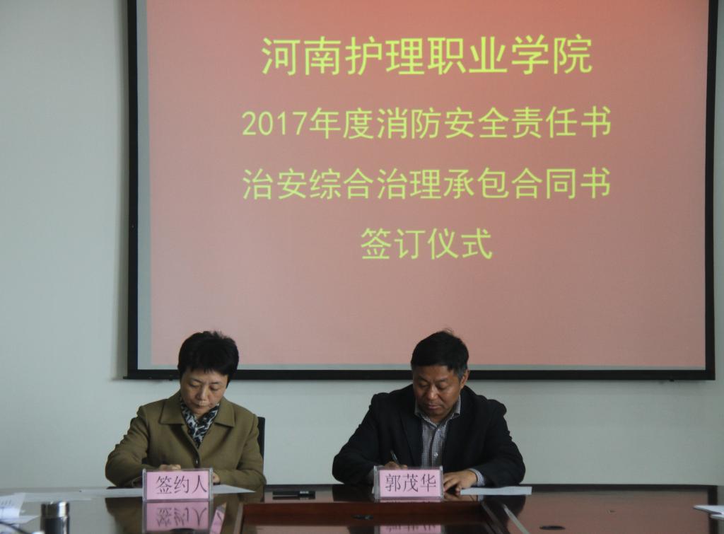 3月31日上午,我院在第一会议室举行了2017年度消防安全责任书和治安综合治理承包合同书签订仪式,学院领导与各处室、系部负责人参加了签订仪式。
