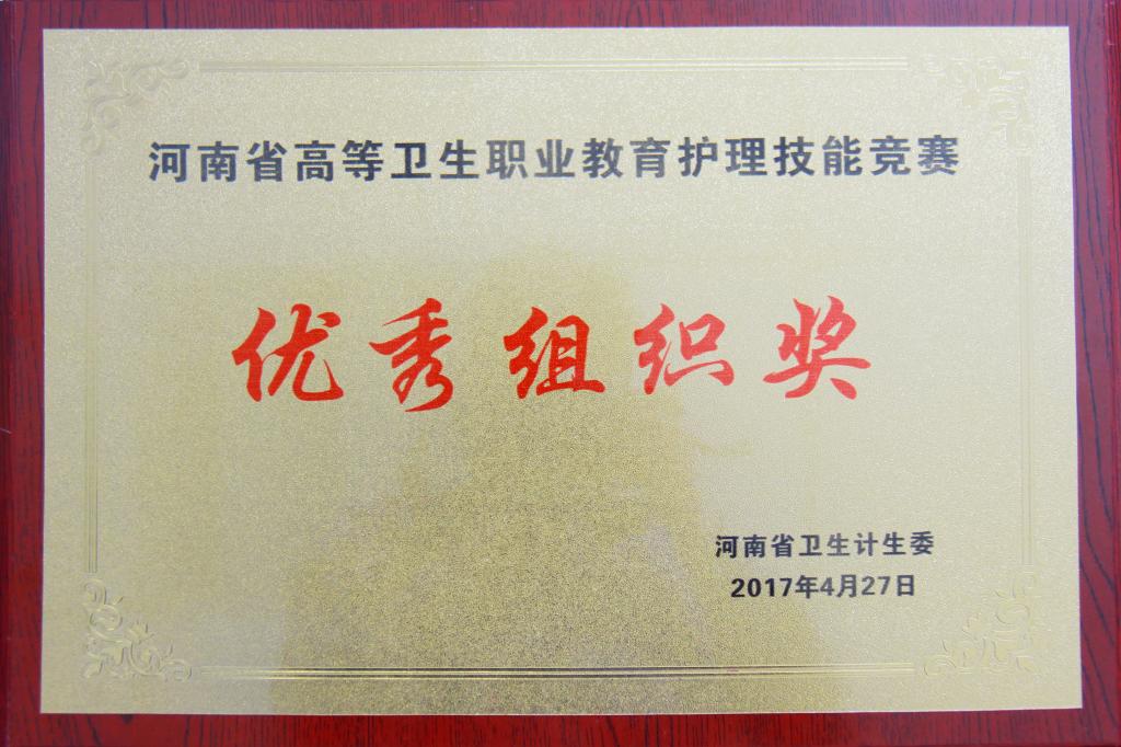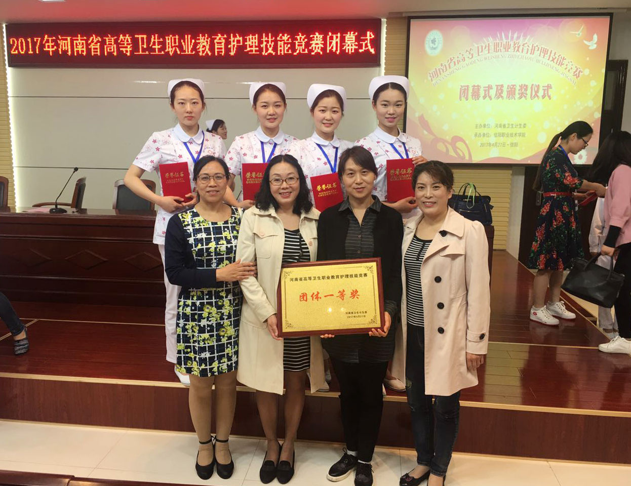 4月26日至27日,我院护理系主任何敏率队参加在信阳职业技术学院举行的2017年河南省高等卫生职业教育护理技能大赛。我院选手不畏强手,凭借扎实的基础理论知识、规范标准的操作技能,默契高效的团队协作,从全省28所高等卫生职业院校的112名选手中脱颖而出,荣获团体一等奖、优秀组织奖,总分排名第二的优异成绩。其中,参赛学生杨静、赵小菡、文婧、焦靖靖荣获一等奖,指导老师吕海琴、付保芹、王艾青、杨艳英荣获优秀指导教师奖。
