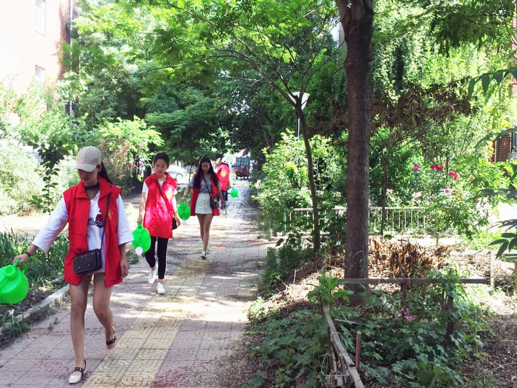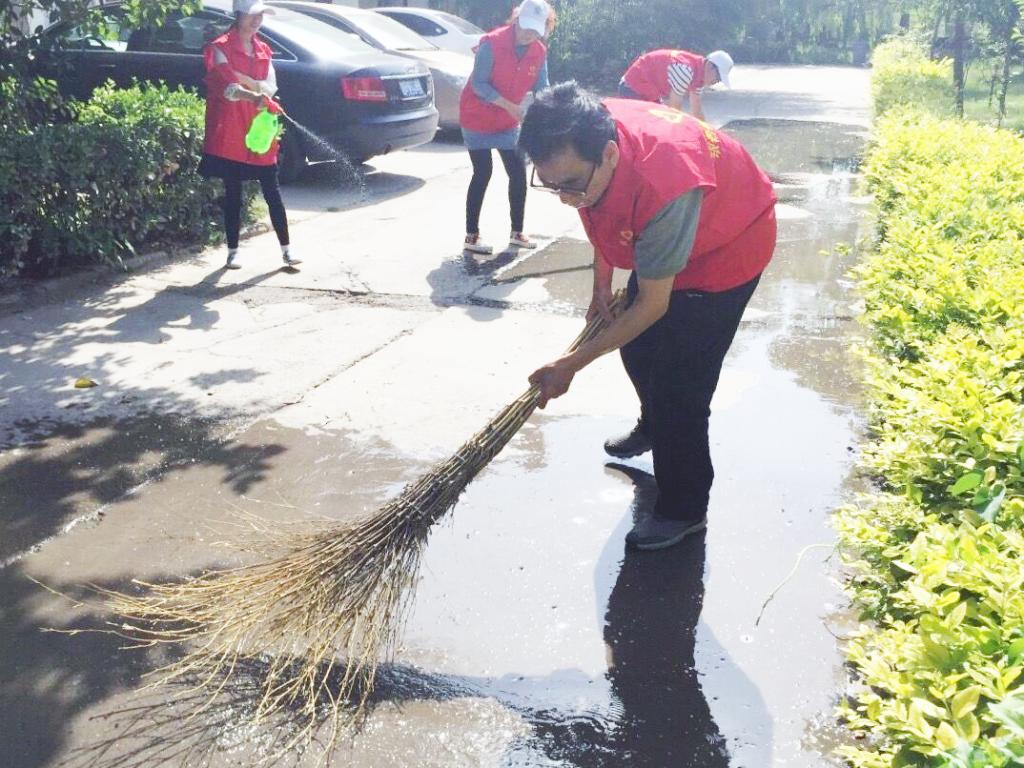 上午9点,在简短的仪式后,志愿者们就迅速开始了清洗活动。大家挽起袖子加油干,不怕脏,不怕累,用水管冲,用拖把拖,用抹布抹,用剪刀剪,用了一个多小时的时间,把沿街的玻璃门、窗户、绿化带、路面、宣传栏、围栏、果皮箱、墙壁、柱子等地方都打扫得干干净净,一尘不染。看着自己的劳动成果,大家的心里亮堂堂、美滋滋的。
