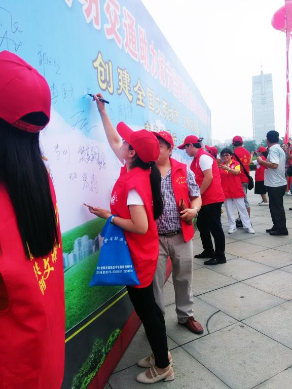 启动仪式结束后,我院郭海旺、王莹等志愿者纷纷在印有“创建全国文明城市,文明交通在行动”主题背景墙上郑重签下自己的名字,承诺自觉遵守交通规则,做一名文明交通的执行者和倡导者。
