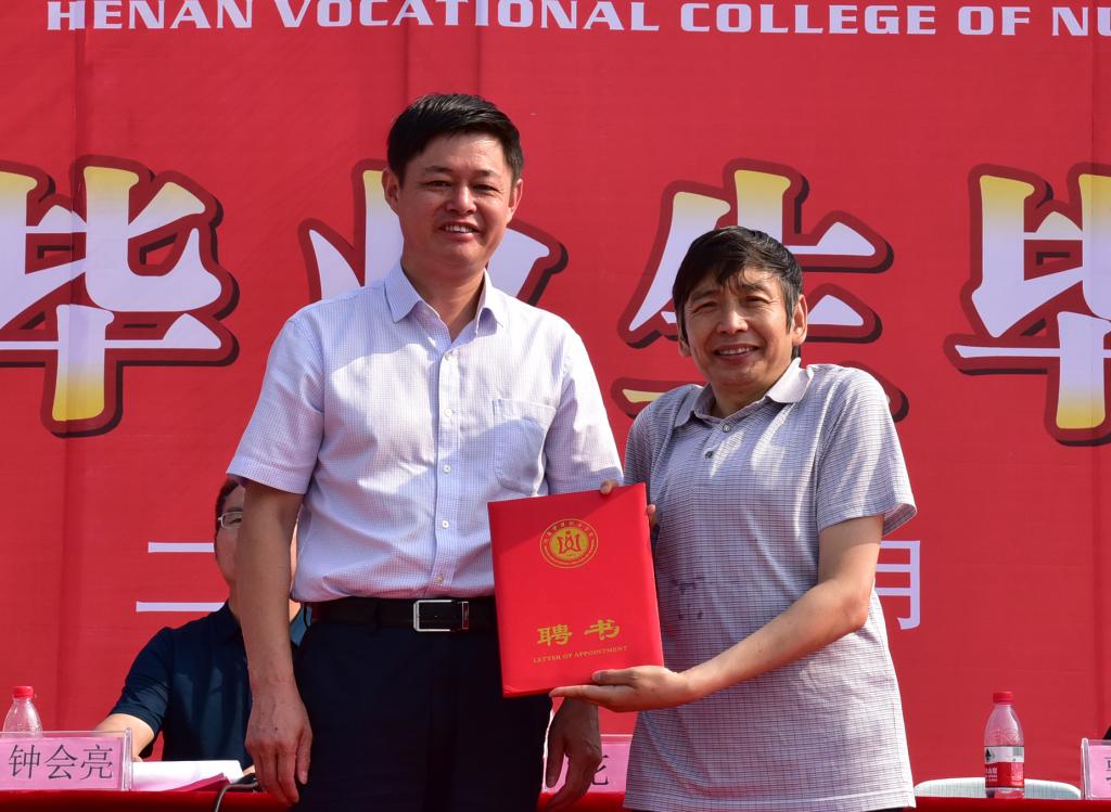 学院党委书记花明为河南驼人集团党委书记、董事长王国胜颁发荣誉聘书,特邀王国胜为学院创新创业导师,希望学院能在王国胜导师的指导下,培养造就出更多的“大众创业、万众创新”的生力军。王国胜导师在毕业典礼上分享了自己的艰苦创业经历,指出了健康产业在21世纪新兴产业中的重要性,希望毕业生能选择正确方向、保持坚韧不拔的毅力,心存远大理想,脚踏实地。