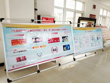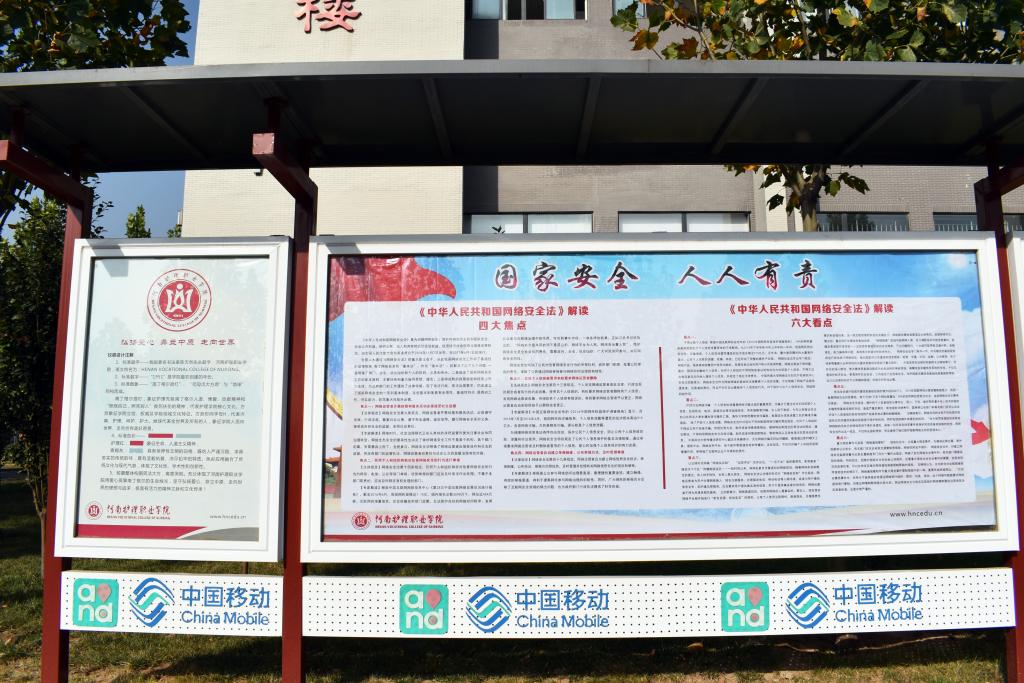 | 在校内教学楼、基础实训楼等大厅处设立网络安全知识及法律法规为主要内容的展板。 |