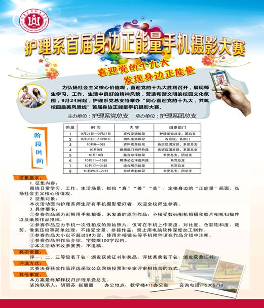 为弘扬社会主义核心价值观,喜迎党的十九大胜利召开,展现师生学习、工作、生活中良好的精神风貌,营造和谐文明的校园文化氛围,9月25日,护理系党总支正式启动“同心喜迎党的十九大,共筑校园最美风景线”首届身边正能量手机摄影大赛。