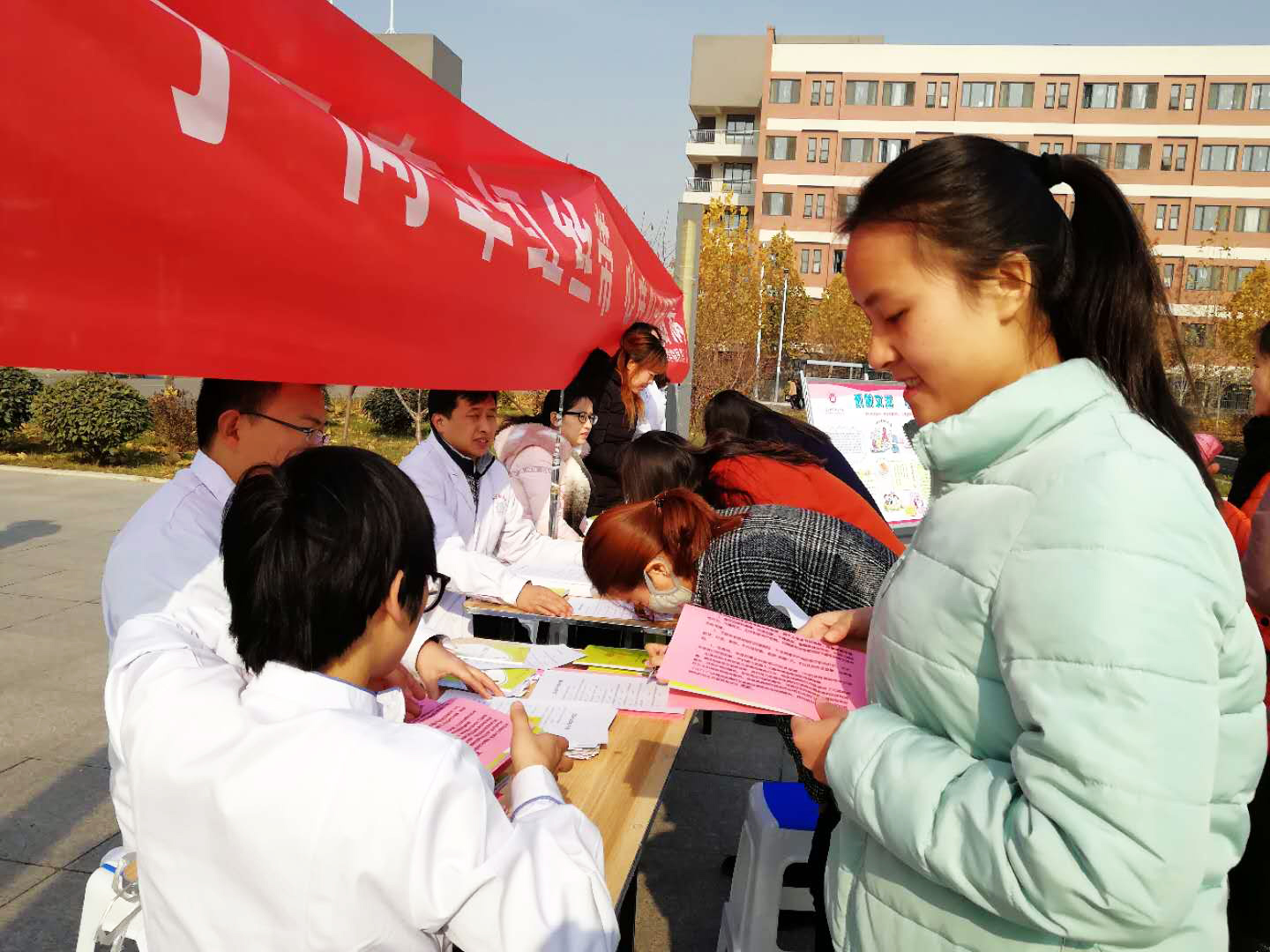 当日上午,在我院南丁格尔广场进行了“预防艾滋 珍爱生命”“手牵手同牵红丝带,心连心共防艾滋病”等围绕主题的宣传教育活动。悬挂条幅,宣传展板等设置,发放宣传彩页、折页等3000余份宣传资料,扩大宣传艾滋病防治知识宣传氛围。活动中学生们进行了问卷答题及相关问题的咨询。