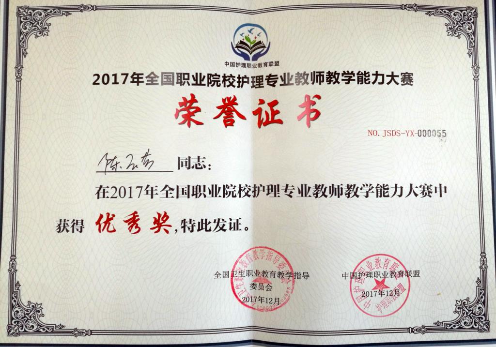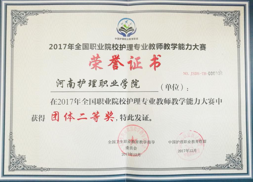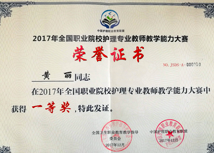 2017年12月14日—17日,首届全国职业院校护理专业教师教学能力大赛在山东省滨州职业学院隆重举行,我院护理系主任何敏带队参加比赛。经过激烈角逐,我院代表队荣获团体二等奖,护理系教师黄丽荣获一等奖,陈玉芳荣获优秀奖。