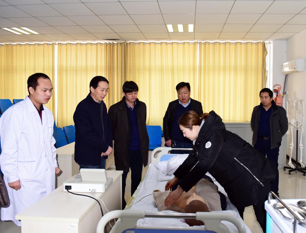 院党委书记花明代表学院对卫计委领导的到来表示热烈欢迎,同时对学院的基本情况和近几年在新校区建设、实验室建设、专业建设和校企合作等方面取得的进展一一进行了介绍,并详细参观了学院护理实训中心。在模拟ICU病房、模拟手术室,杨处长认真聆听实验室讲解员对实验操作原理及方法的介绍,当看到全国职业院校护理专业教师教学能力大赛一等奖获得者黄丽老师的心肺复苏示范操作后,杨处长对我院教师严谨的治学态度、一流的教学水平大加赞赏,对先进的实验设施、优美的教学环境给予了高度评价,对新校区建设取得的成绩给予了充分肯定。