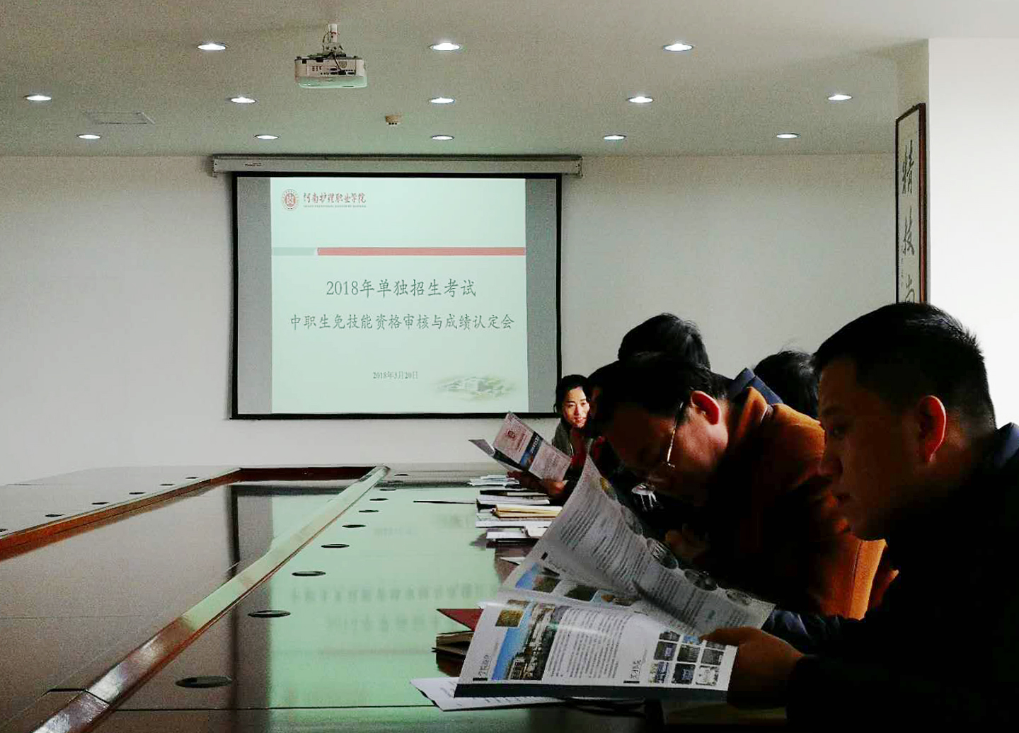 3月20日上午,我院在学院二楼会议室组织召开2018年单独招生考试中职生免技能资格审核与成绩认定会。副院长张淑爱、单招考试领导小组及考务组全体成员参加会议。会议由教务处处长朱秀敏主持。