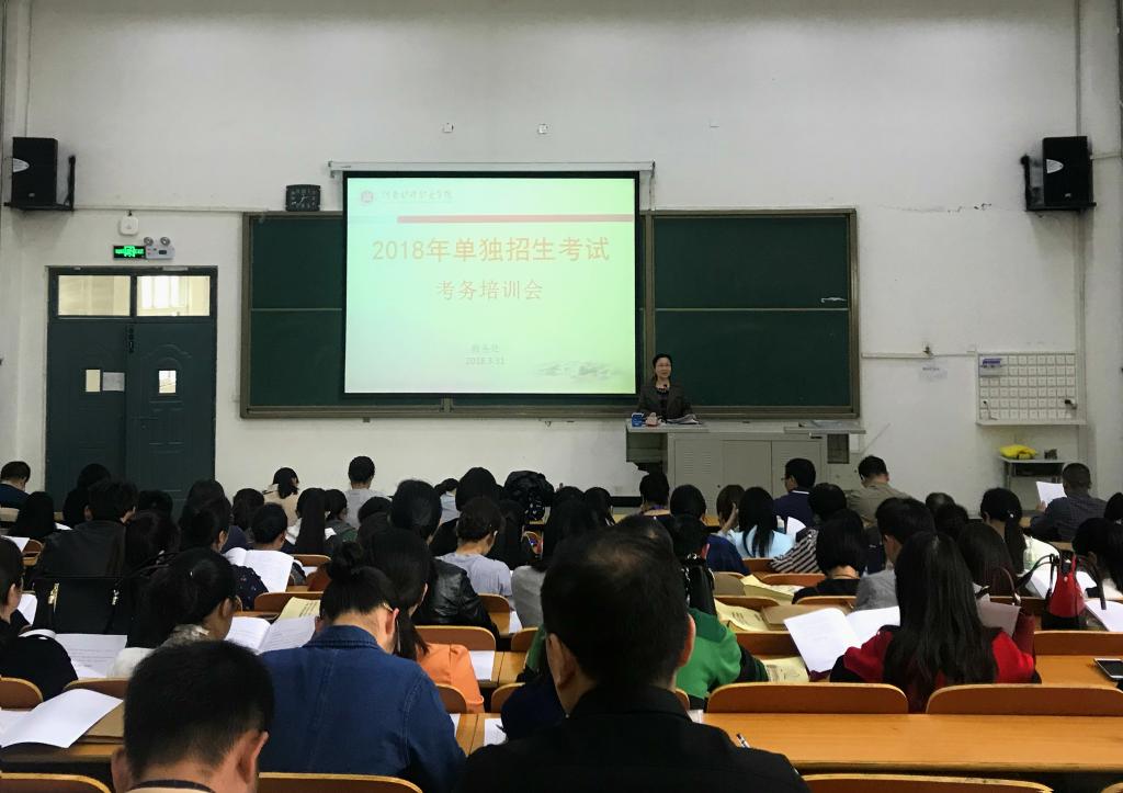 3月31日下午,我院在教学楼107教室召开2018年单独招生考试考务培训会议。考试工作委员会副主任、教学副院长张淑爱,校内巡视组成员、教务处全体成员及全体监考老师参加会议。教务处处长朱秀敏主持会议。