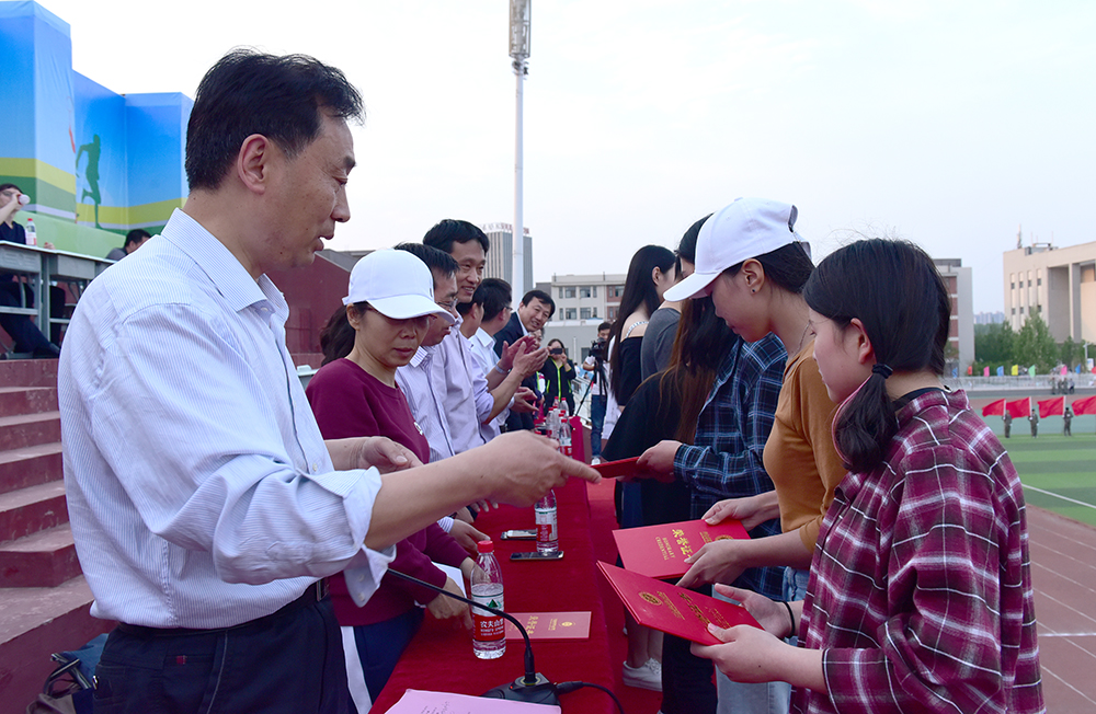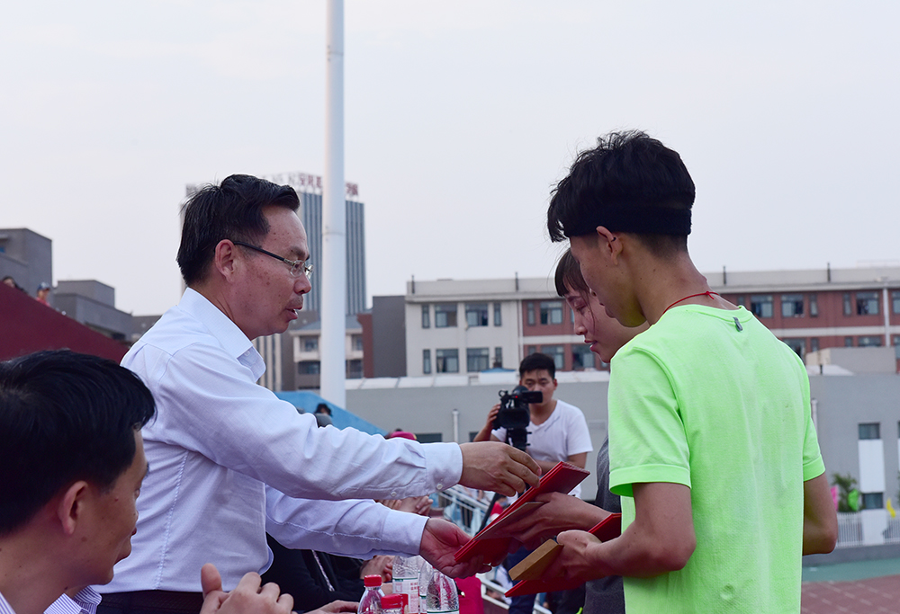 组委会总裁判长周丹萍宣读了本届运动会获奖名单及破纪录名单。组委会委员为运动会甲组团体和乙组团体总分前三名获奖班级及获得体育道德风尚奖的团体颁奖。副院长钟会亮为打破校运会记录的两位运动员颁奖。