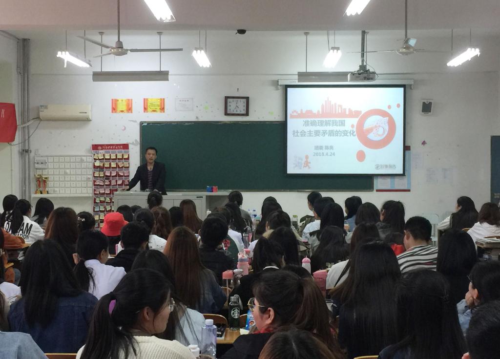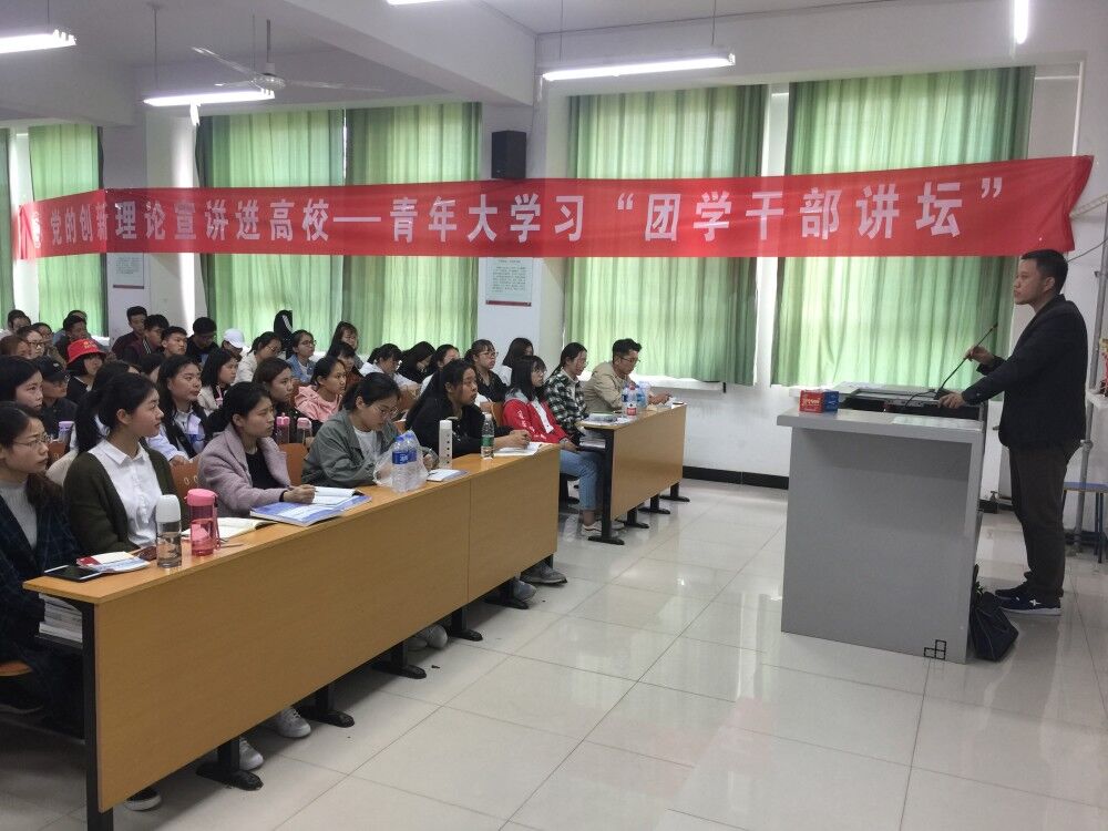为在青年师生中进一步深入学习宣传贯彻习近平新时代中国特色社会主义思想和党的十九大精神,按照省委高校工委、省教育厅和团省委、团市委党的创新理论宣讲工作安排,4月24日下午,院团委在教学楼408室开展首场“党的创新理论宣讲进高校”——“青年大学习”团学干部专题讲座。院团委全体专职团干、2016和2017级团学干部、“青马工程”培训班全体同学以及部分学生代表参加。