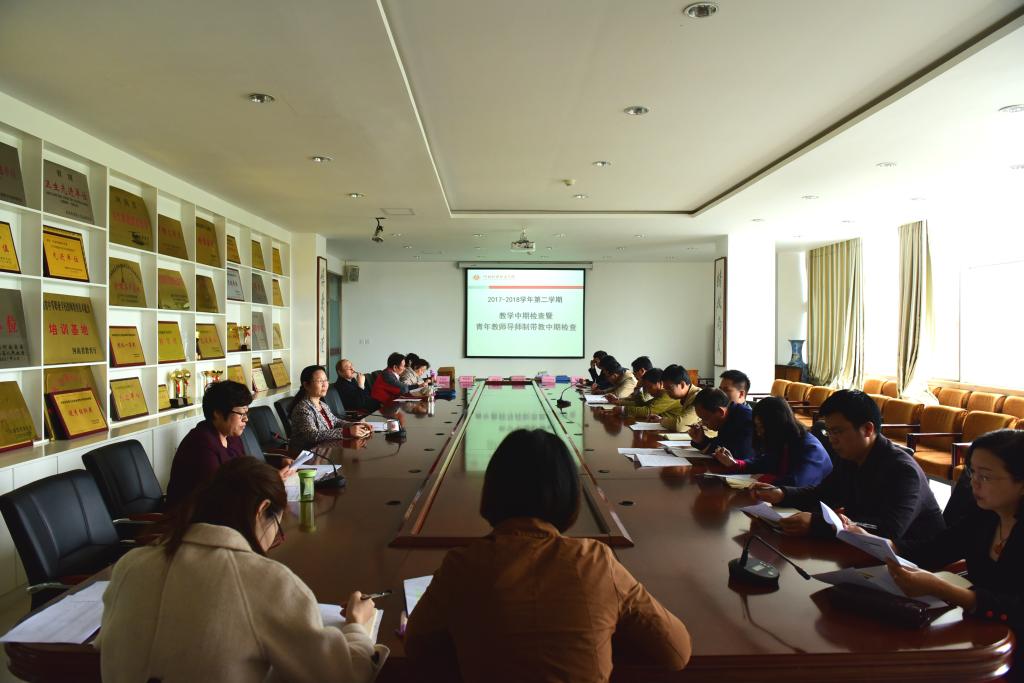 为进一步加强教学管理,以查促建、以查促管、以查促改,扎实推进教风、学风建设,不断提高学院人才培养质量,4月25日上午,教务处在学院二楼会议室组织2017-2018学年第二学期教学中期检查暨青年教师导师带教制中期检查。副院长张淑爱、学院教学督导专家、教务处、各系部负责人及教学干事参加会议。会议由教务处处长朱秀敏主持。