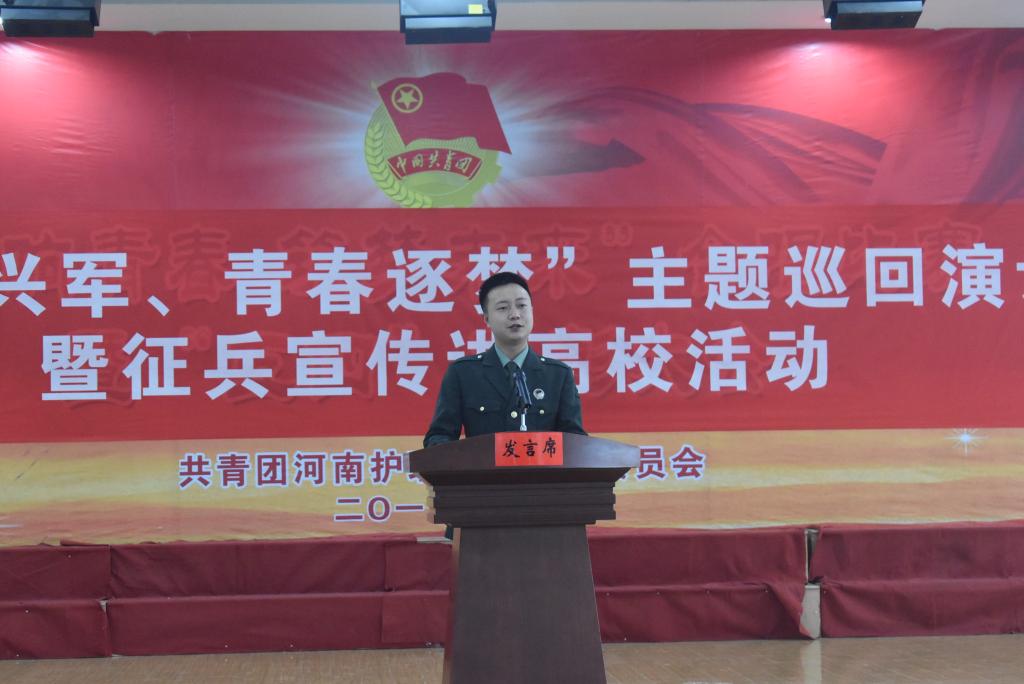 5月9日下午,安阳军分区“强军兴军、青春逐梦”主题巡回演讲暨征兵宣传进高校首场活动在我院多功能厅举行。安阳军分区国防动员处处长王庆新、文峰区人民武装部部长玄红强、副部长刘华等同志出席,各系有参军意向的近200名男同学参会。活动由学生处副处长金志利主持。
