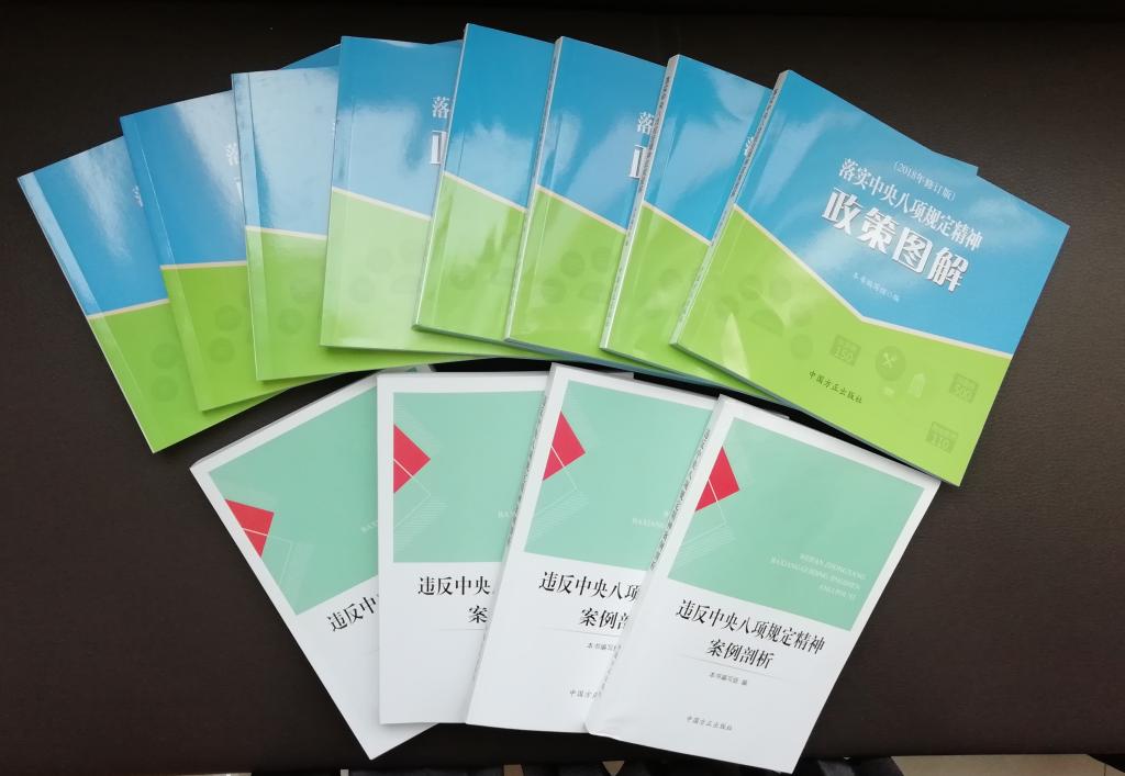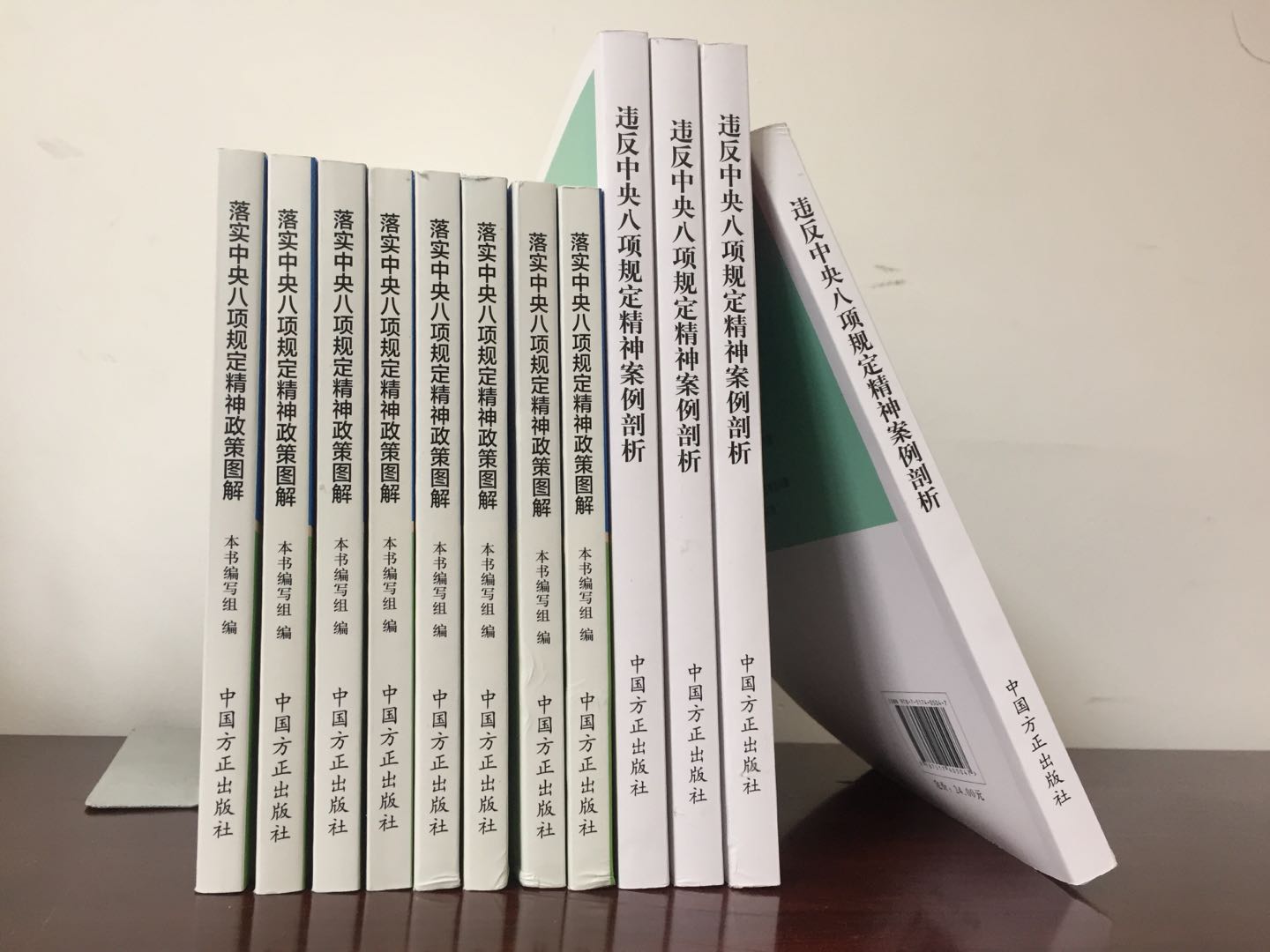 其中,《违反中央八项规定精神案例剖析》一书选取中央纪委国家监察网站通报曝光的60起违反中央八项规定精神典型案例,收录36部十八大以来党风廉政新规,是学习贯彻中央八项规定精神的重要辅导读物;《落实中央八项规定精神政策图解》一书共收录26个规定,从公务外出、公务接待、公务用车、会议活动、办公用房、个人自律等六个专题,对十八大以来中央制定颁布的关于党员领导干部廉洁自律的系列规定以图文并茂、生动直接的方式进行了解读。该书既是党员领导干部的工具书,又是约束自身行为的好帮手,可谓“一册在手,规范不愁”。