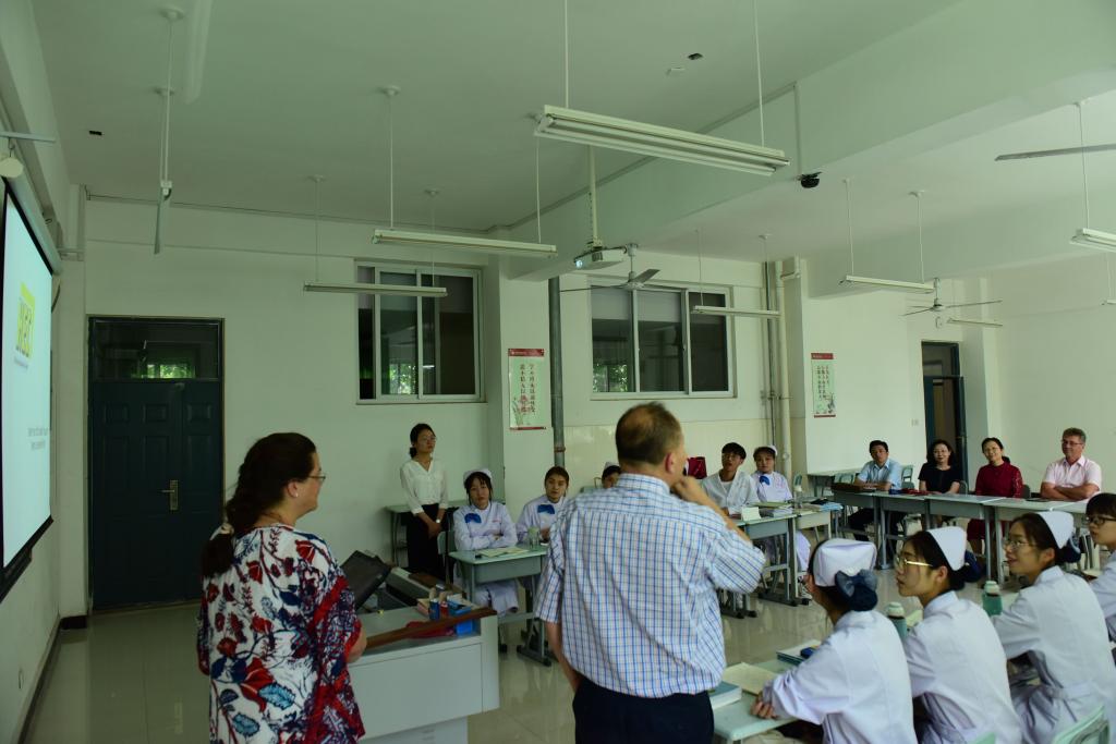 德国客人首先在学院领导的陪同下来到了基础实训楼A202教室与德语护理班的同学进行了互动。德方客人分别进行了自我介绍并通过PPT的形式对“留德三年带薪学习”合作项目向我院学生做了详细解读。同学们对项目表示出极大的兴趣,分别就赴德费用、实习工资、住宿安排、出国时间等问题进行了提问交流。德方对我院德语护理学生的外语水平给予高度评价,并根据我院德语教学实际提出了很多建设性意见,对教学重点、难点和教学方法进行了交流和研讨。在随后的座谈中,副院长张淑爱代表学院对远道而来的德国客人表示热烈的欢迎。张院长强调,护理人才的培养是造福人类的大事,学院一直致力于国际化教育,立足河南、服务全国、走向世界为我院的办学定位,毕业生与德方的需求高度契合,希望德方在我院积极开展合作,促进我院国际化护理人才的培养。张院长指出,非常感谢德方对德语护理学生的指导,希望德方与我院进一步加强交流,为双方的合作打下更加坚实的基础。