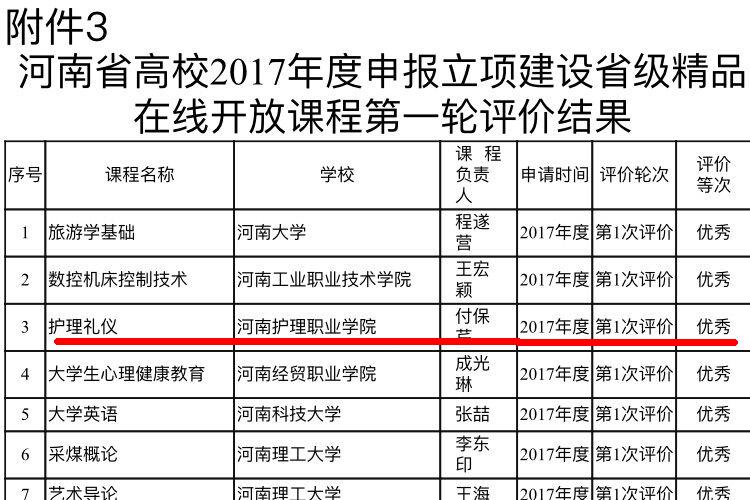 近日,河南省教育厅下发《关于公布2017年度河南省精品在线开放课程评价结果的通知》(教高〔2018〕395号),对2016、2017年度全省申建的184门课程进行评价。通过网上监测和专家评议,2017年度由我院付保芹老师主持申建的《护理礼仪》课程获评优秀等次,实现了我院省级精品在线开放课程建设的新突破。据悉,2017年度省级立项课程97门,评为优秀的20门。