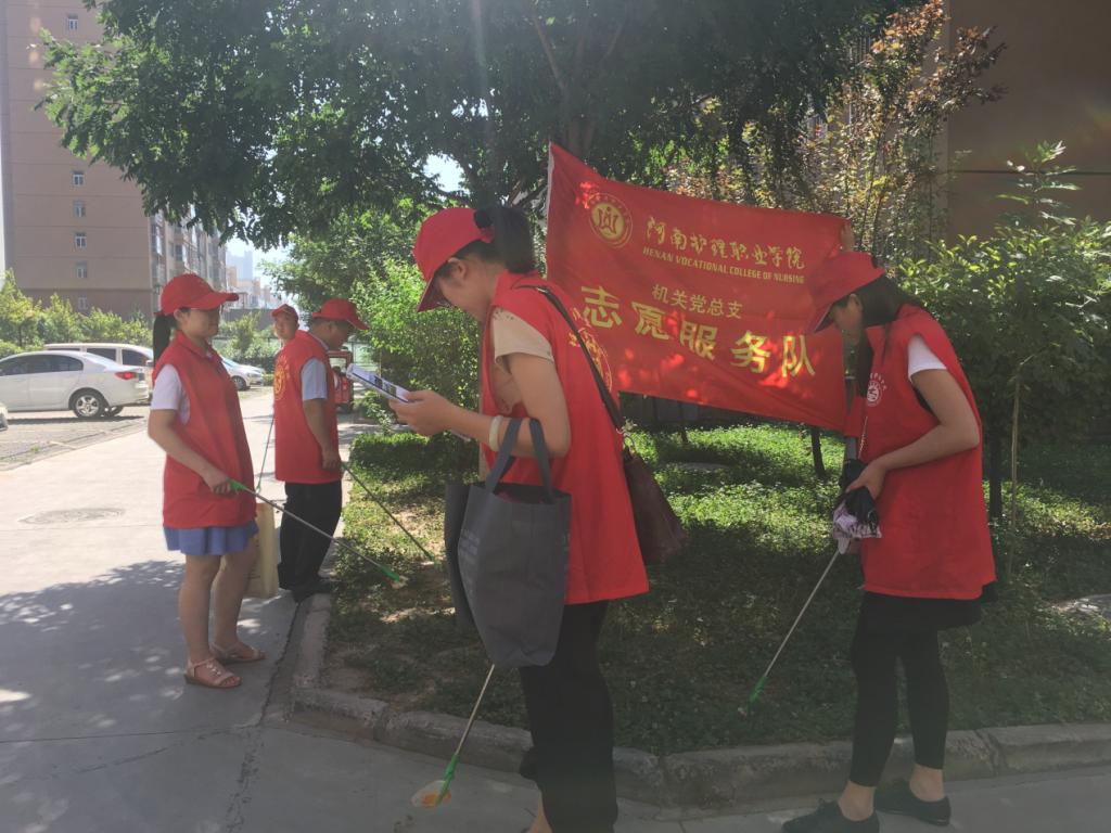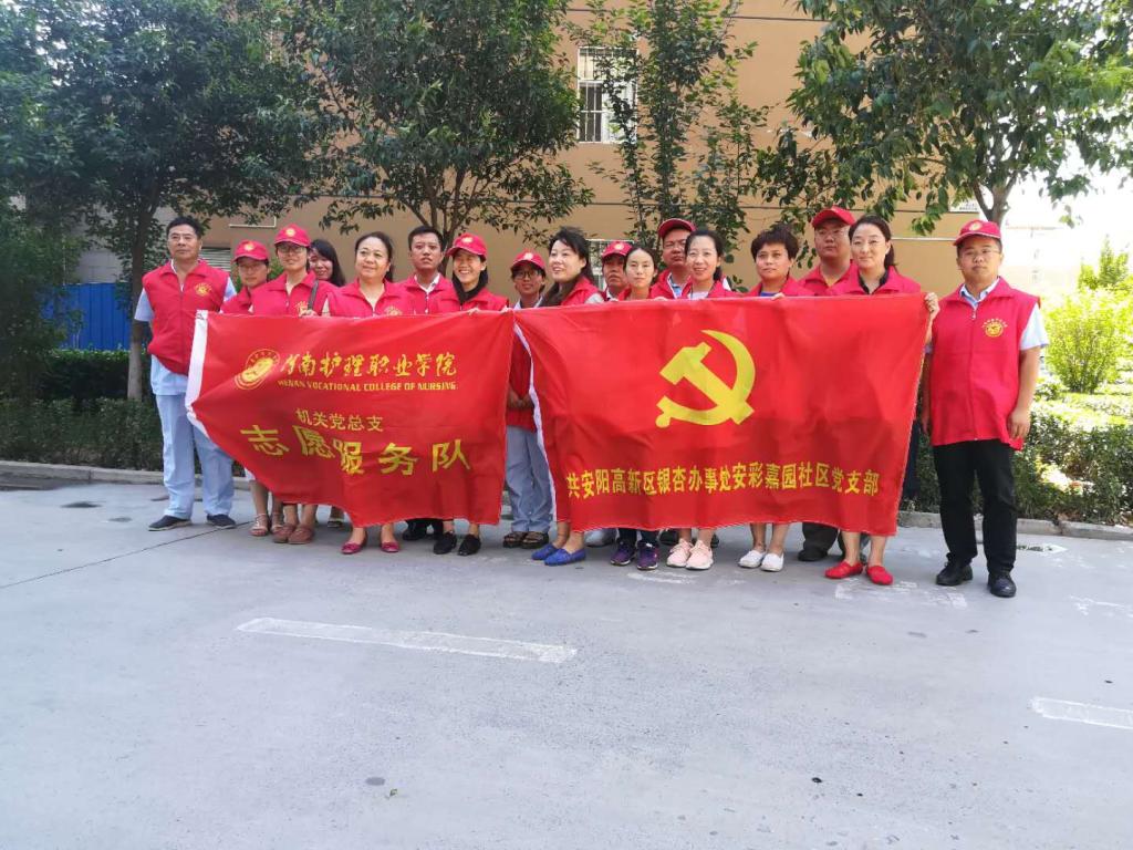 为深入学习宣传贯彻习近平新时代中国特色社会主义思想和党的十九大精神,更好地发挥党员的先锋模范作用,充分体现高校服务社会的优势,6月28日上午,学院机关党总支组织部分党员携医务室工作者组成志愿服务小分队,前往安彩家园社区开展志愿服务活动。
