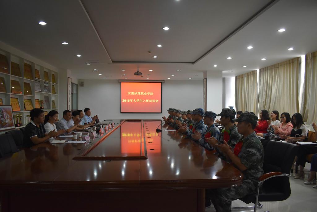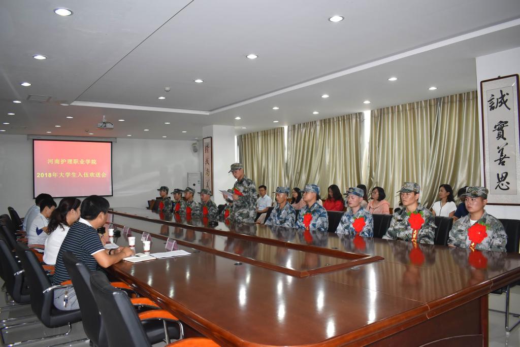 9月10日下午, 学院在大会议室为即将奔赴边疆的2018年应征入伍大学生举行欢送会,11名身披戎装、胸戴红花的大学生士兵参加。学院党委副书记、工会主席胡景团出席并讲话,三系党总支书记、学生处全体工作人员、入伍大学生的班级辅导员老师参加欢送会。欢送会由学生处处长、武装部部长李艳芳主持。