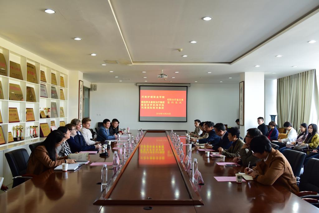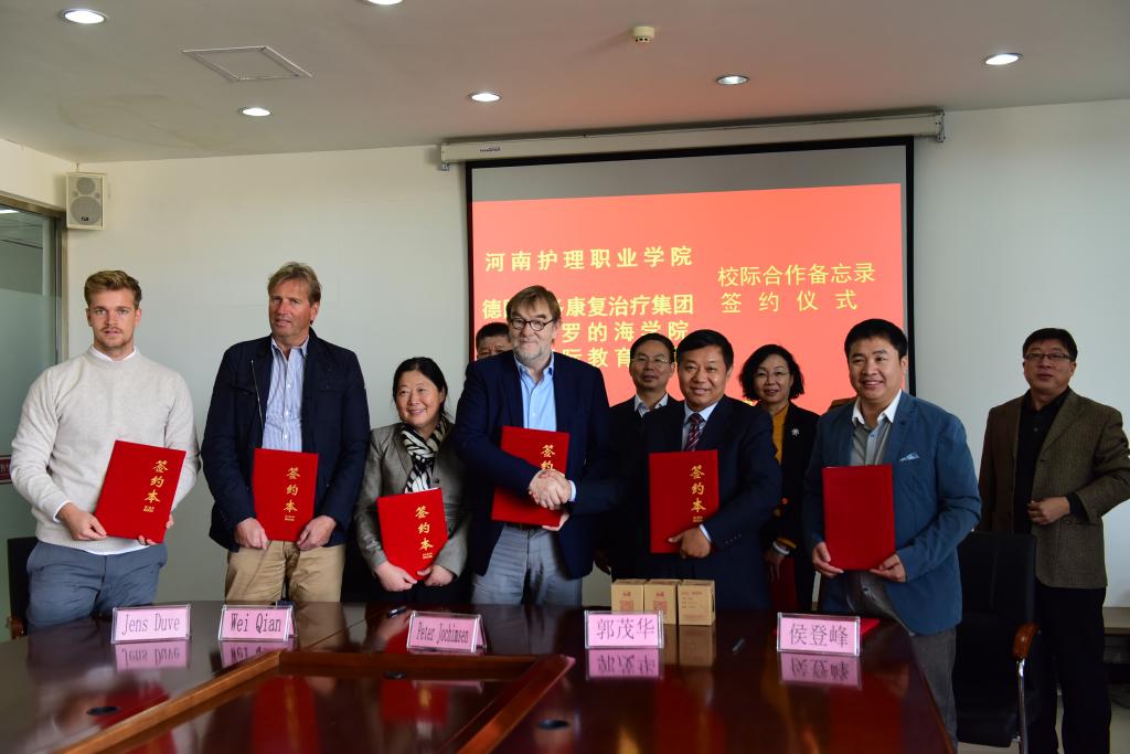 10月24日上午,我院与德国恩多康复治疗集团、德国波罗的海学院、玛雅国际教育集团在第一会议室举行了校际合作交流备忘录的签约仪式。赫里奥斯医疗集团股东、恩多康复治疗集团董事长Jens Duve,中国项目经理Dennis Duve,原汉堡康复医院院长、德国波罗的海学院主席Peter Jochimsen,德国波罗的海学院校长、德中协会副会长Wei Qian,玛雅国际教育集团董事长侯登峰等一行九人及我院院长郭茂华、副院长钟会亮出席签约仪式,招生处、人事处、学生处、护理系的主要负责人参加了仪式。