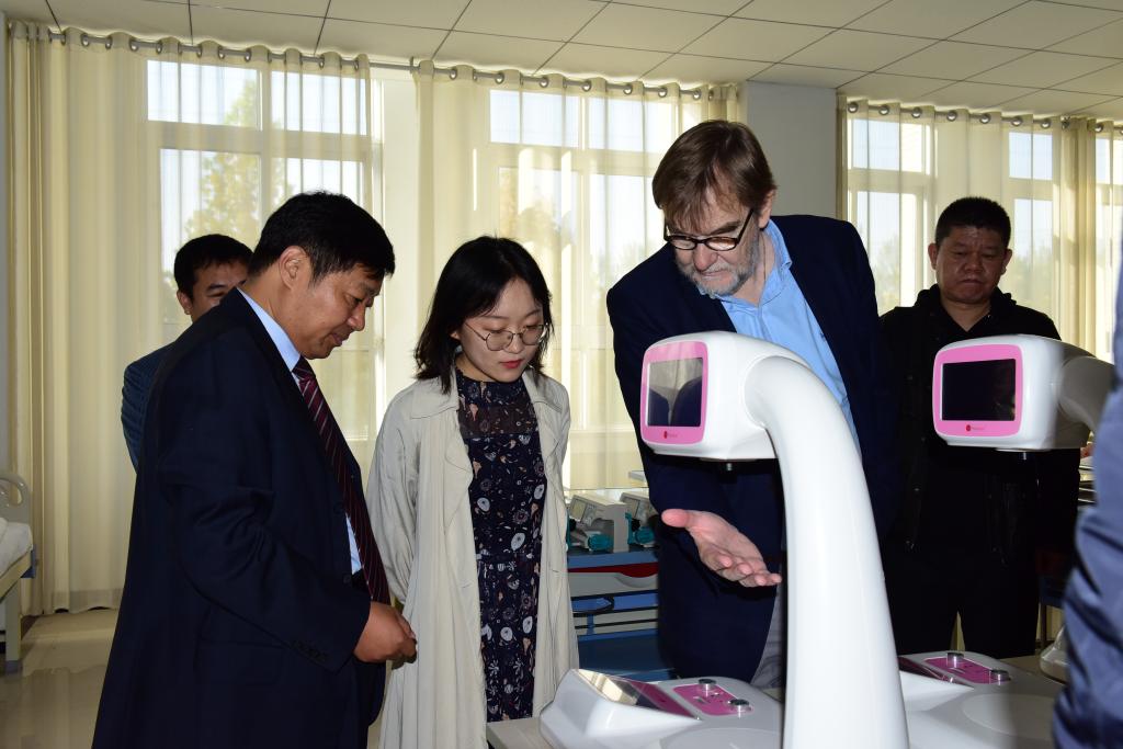 郭茂华院长亲切会见了Jens Duve一行,并对来宾们表示热烈的欢迎。郭院长、钟院长陪同来宾一同参观了学院护理实训楼的综合技能考核室、心肺复苏实训室、模拟ICU病房、模拟手术室、儿科实训室等实训场所,Jens Duve一行对我院先进的实验实训设备、一流的实训条件大加称赞。随后,德国客人在学院领导的陪同下来到了护理实训楼610教室与德语护理班的同学进行了互动,Peter Jochimsen热情地与我院学生进行交流。同学们用熟练的德语分别向Peter Jochimsen咨询着出国程序、外语培训、赴德费用、实习工资、住宿安排、出国时间等问题。Peter Jochimsen详细解答了学生提出的问题,并就德国项目进行了简要介绍,德方对我院德语护理学生的外语水平给予高度评价,并表示热烈欢迎我院学生去德国留学就业。