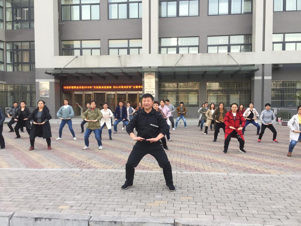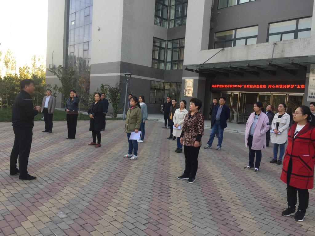 10月30日下午4:00,我院在护理实训楼东门小广场举行了“弘扬优秀传统文化,共筑和谐健康河护”太极拳培训活动开班仪式,此次活动特邀请保卫处处长杨哲为教职工们进行公开培训。