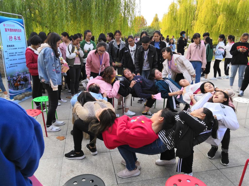 开幕式活动现场,心理中心工作人员向同学们介绍获得心理帮助的途径,发放宣传资料,近2000名同学热情踊跃地体验了六项团体游戏活动,现场热闹非凡。