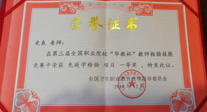 11月29日--12月2日,由全国卫生职业教育教学指导委员会主办的“第三届全国卫生职业院校教师检验技能大赛”在扬州市职业大学举办,我院首次派出两位青年教师参赛并荣获佳绩,其中史良老师获免疫学检验项目一等奖,杜尚珂老师获血常规检验项目二等奖。