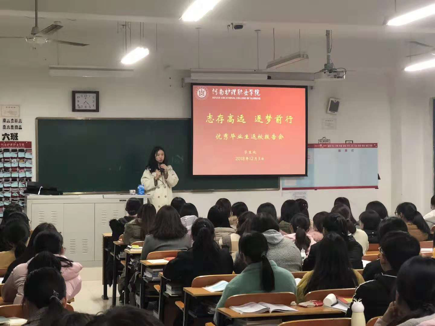 为指导低年级学生学习,激励其尽早树立人生目标,12月3日晚自习时间,学生处邀请优秀毕业生张婧返校,在教学楼108教室举办了“志存高远 逐梦前行”为主题的优秀毕业生返校汇报会。张婧是我院首届大专毕业生,她就自己参加工作后的体会,结合其在校的学习,与来自全院近200名学生进行了分享。