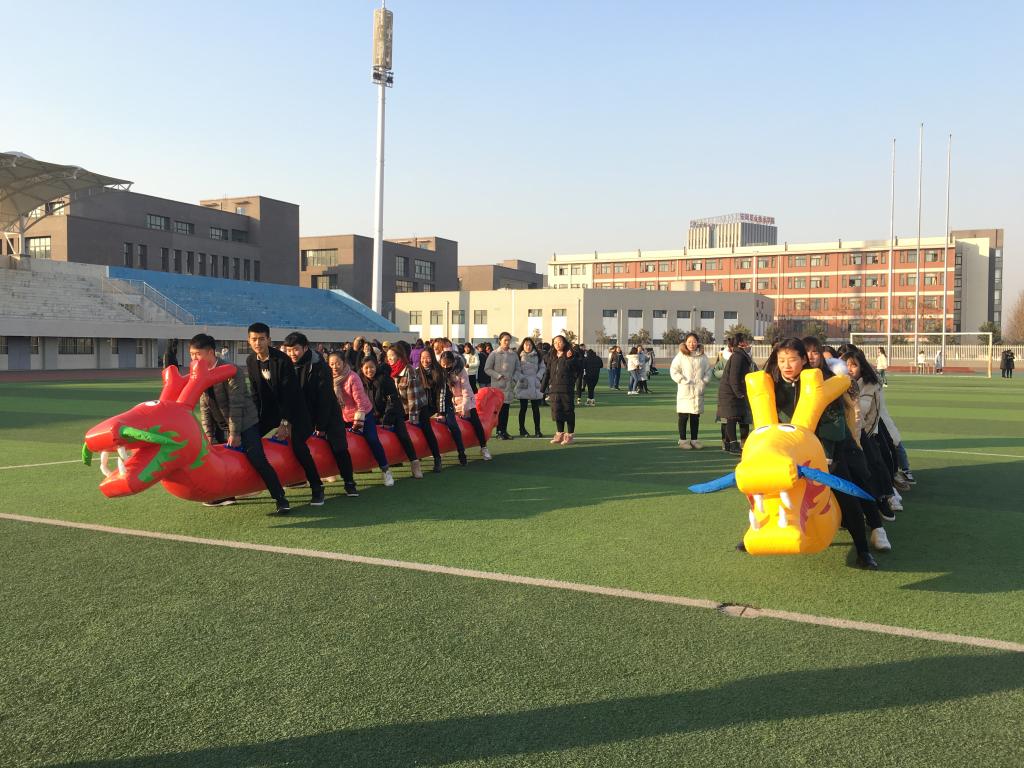 冬日的严寒阻挡不住同学们参加活动的激情。“一二、一二”,参与的同学们排成一列,坐在龙舟上,喊着响亮的口号,迈着整齐的步伐,以腿为桨,向目的地“划去”。“旱地龙舟”这个游戏考验了每个人的协调性和团队的默契度。