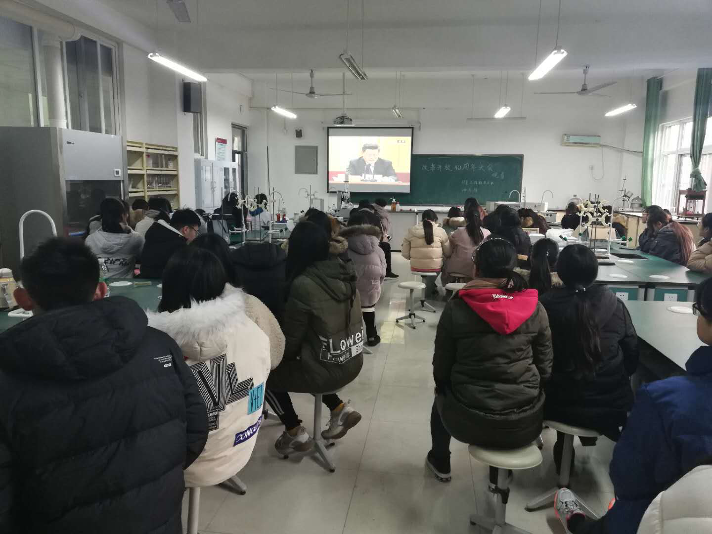 观看过程中,大家全神贯注,认真聆听习近平总书记重要讲话,不时响起热烈的掌声,体现了学院师生对改革开放这个划时代重大事件的热切关注和强烈认同。会后,广大与会教职工充分感到总书记的讲话让人备受鼓舞,倍感振奋,更是为今后做好立德树人工作注入了无穷动力和激情,增加了自豪感、荣誉感和使命感。药检系许卫峰老师感叹,中国能在改革开放40年里做出如此傲人的成绩,就是因为我们走了一条适合自己实际的发展道路——中国特色社会主义道路,未来我们也要跟随党的步伐,坚定走下去。机关党总支李金霏老师表示,这40年来取得的辉煌成绩是人民在党的领导下实实在在干出来的,作为一名教师党员更要继续努力,用实干为时代添光彩,让人生更精彩。护理系助产2班刘雅敏同学说:“在改革开放后成长起来的自己,深切感受到改革开放给自己、家人生活带来的巨大改变,深切感受到改革开放给国家、人民乃至于全世界带来的生机与活力,这说明了中国道路是正确的,要坚定不移地走下去。”医技系18影像2班周唯玉同学说:“今天我们应该感谢那些为了改革开放事业付出自己努力的改革先辈们,是他们为我们创造了今天美好的生活。我们今天出门坐高铁、骑共享单车、使用支付宝结账、进行网络购物,穿着新潮的衣服,不用担心冷暖,坐在舒服的教室里上课,再也不用考虑温饱问题,这一切的一切都是因为我们背后有一个强大的祖国,优秀的共产党组织。作为大学生的我们,更应该汲取前行的力量,珍惜每寸光阴,勇敢地追逐自己的梦想。为把我国建设成为富强、民主、文明、和谐、美丽的社会主义现代化强国而奋斗!”
