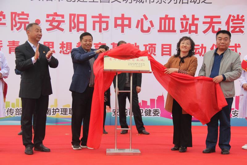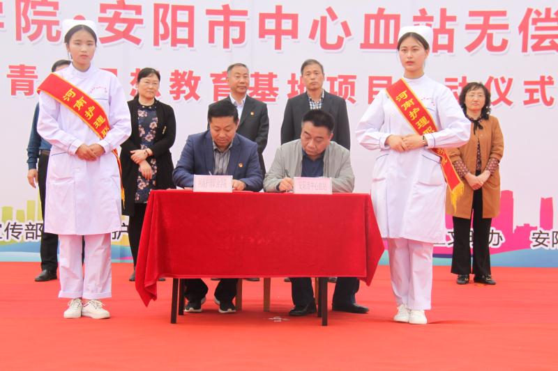 4月24日下午,星空XK体育与安阳市中心血站无偿献血志愿合作暨青年思想教育基地项目启动仪式在我院隆重举行。安阳市委宣传部副部长车俊朝,安阳市卫健委副主任陈美红,文峰区文明办主任刘英,安阳市中心血站党支部书记代金平,星空XK体育党委书记杜天信,党委副书记、院长郭茂华,副院长钟会亮、纪委书记张远出席。仪式由星空XK体育纪委书记张远主持。