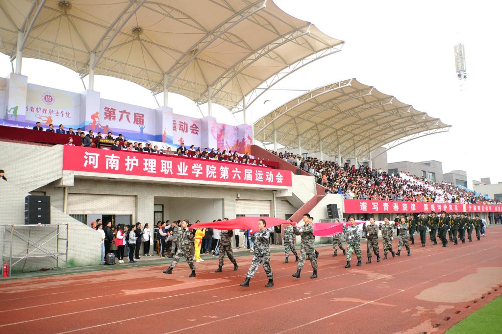 在一片欢呼声中,伴随着激昂奋进的《运动员进行曲》,国旗班护卫国旗、院旗、会旗,迈着坚定有力的步伐率先入场,经过主席台接受检阅,拉开本届运动会的序幕。随后,各系部方阵代表队依次入场,接受全院师生的检阅。整齐的队伍、铿锵有力的步伐、响亮的口号、独特的服装、不时变换的队形、充满创意的入场方式赢得了阵阵掌声,青春洋溢的笑脸、迎风飞舞的旗帜、鲜艳夺目的花球,无不展现出河护人朝气蓬勃、昂扬向上、健康亮丽的精神风貌。