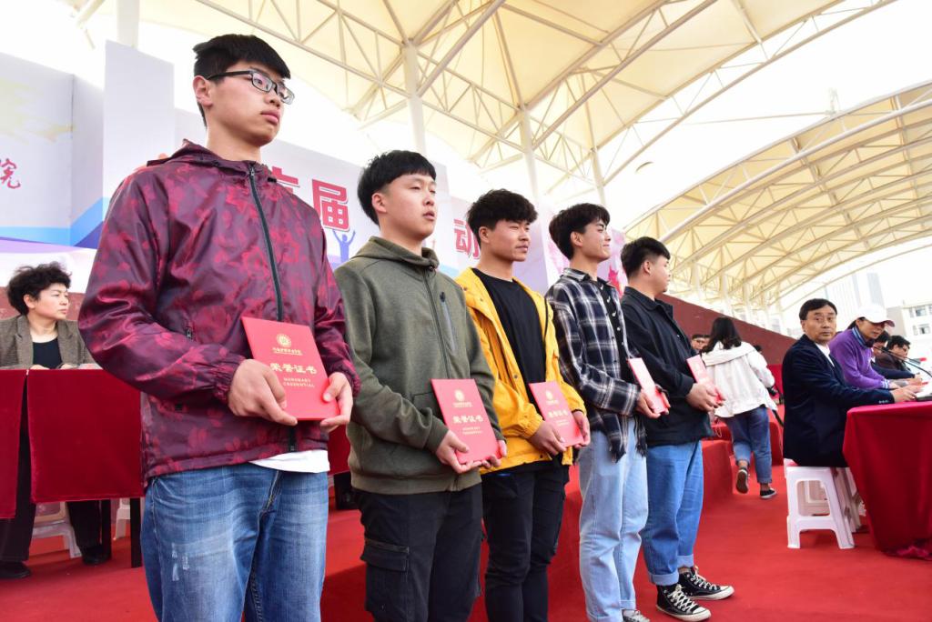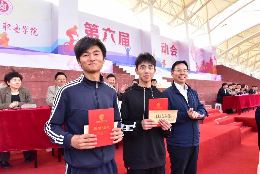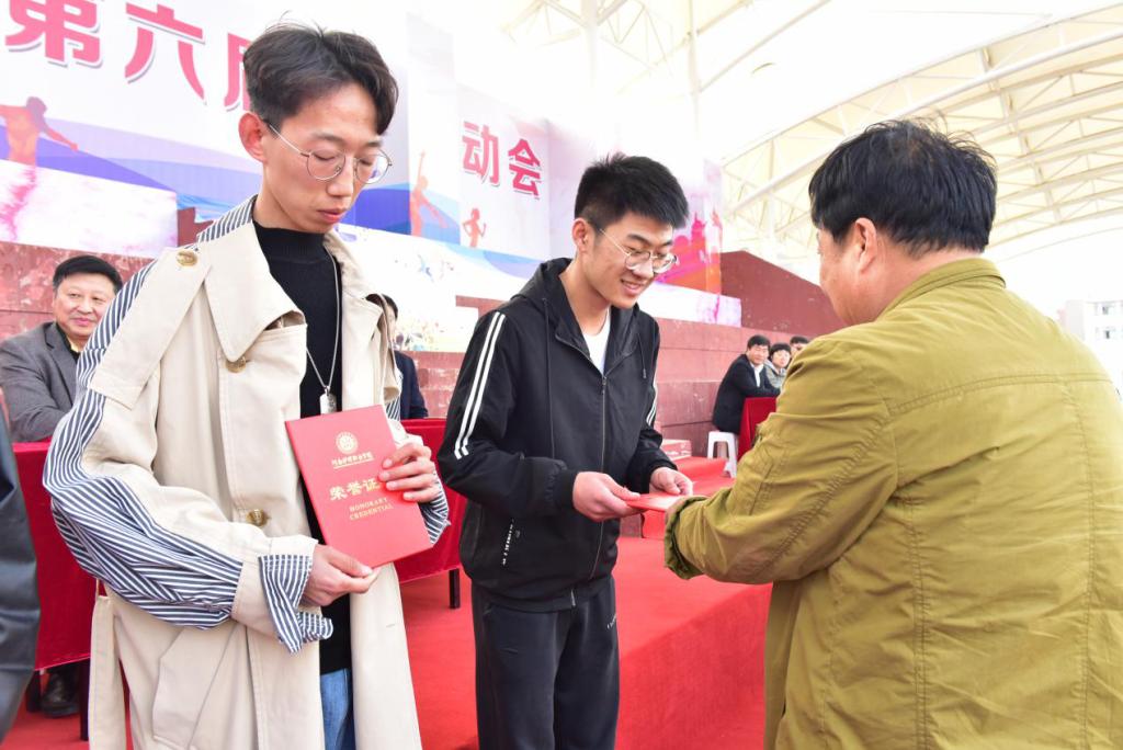 组委会总裁判长周丹萍宣读了本届运动会获奖名单及破纪录名单。谭予星主任和周丹萍总裁判长分别为运动会总分前三名获奖班级及获得体育道德风尚奖的团体颁奖。副院长钟会亮为打破校运会记录的两位运动员颁奖。