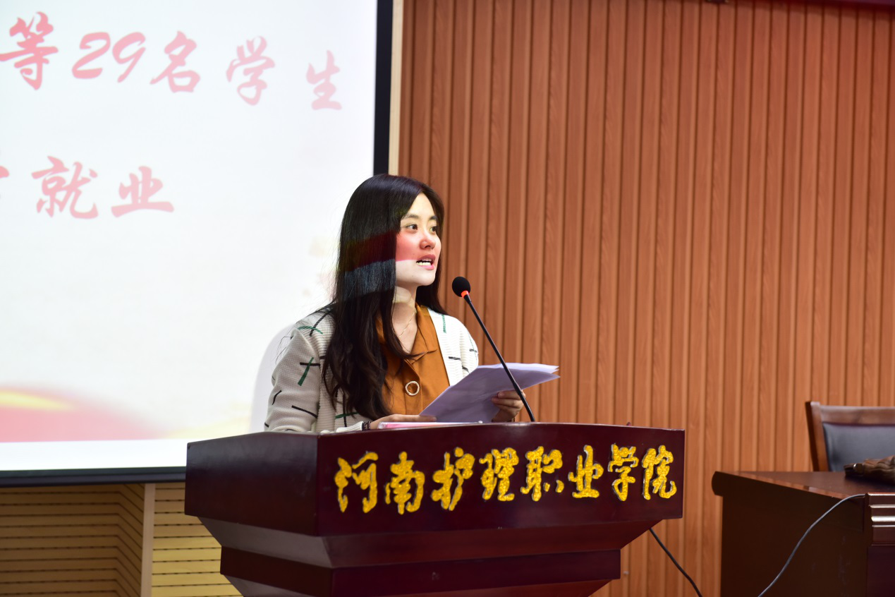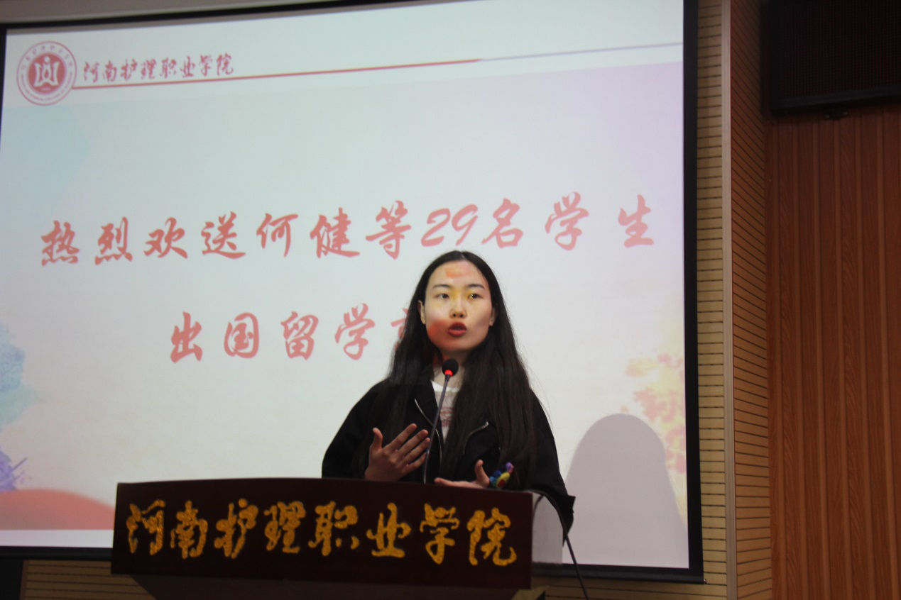 郭院长在讲话中指出,学院主动顺应国家“一带一路”发展战略良好机遇,高标准建设涉外护理专业,经过几年努力,教学质量明显提升、教育成果日臻丰硕、就业渠道有力拓宽。生源由2013年的55人,增加到现在的844人,每年毕业生护士资格证通过率均在87.5%以上。毕业生分布在美国、澳大利亚、日本等8个国家留学或就业,同时,国内高端就业的毕业生逐年增加。郭院长语重心长地叮嘱大家,一要时刻秉承河护精神,为国争光。无论在哪里,始终铭记他们代表的不仅仅是自己,还代表着母校,代表着国家,要充分展现出中国“礼仪之邦”的大国形象。二要树立感恩意识,为校荣光。乌鸦反哺,羊羔跪乳。时刻铭记住父母的养育之恩、铭记住老师的培养之恩、铭记住同学的同舟之情。三要坚定追梦脚步,为己耀光。充分利用国外优质教育资源,学术上勤于学习,在事业上有所建树。最后,郭院长引用梁启超先生的话送给大家:“天戴其苍,地履其黄;纵有千古,横有八荒;前途似海,来日方长”,期盼学子们早日学成归来,报效祖国!