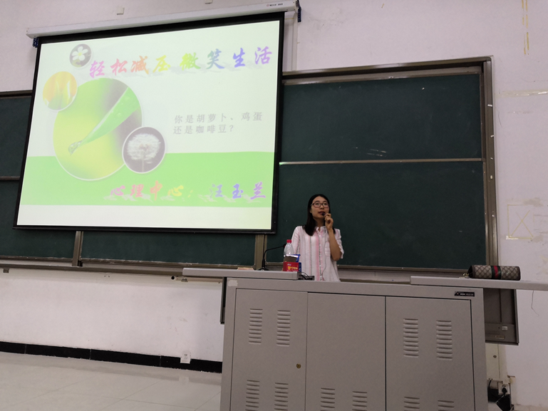 5月30日下午,在教学楼308教室,心理健康教育与咨询中心为班级心理委员及学院心理联合会成员开展了《轻松减压微笑生活》为主题的讲座。汪玉兰老师通过日常生活中的小案例,使同学们对人的不同情绪产生初步认识,又借助心理测试和小故事引出了情绪与健康的关系,从而引出“情绪ABC理论”,通过讲解,鼓励大家用正向思维来看待事物,提出了我们控制自己情绪的技巧与方法。