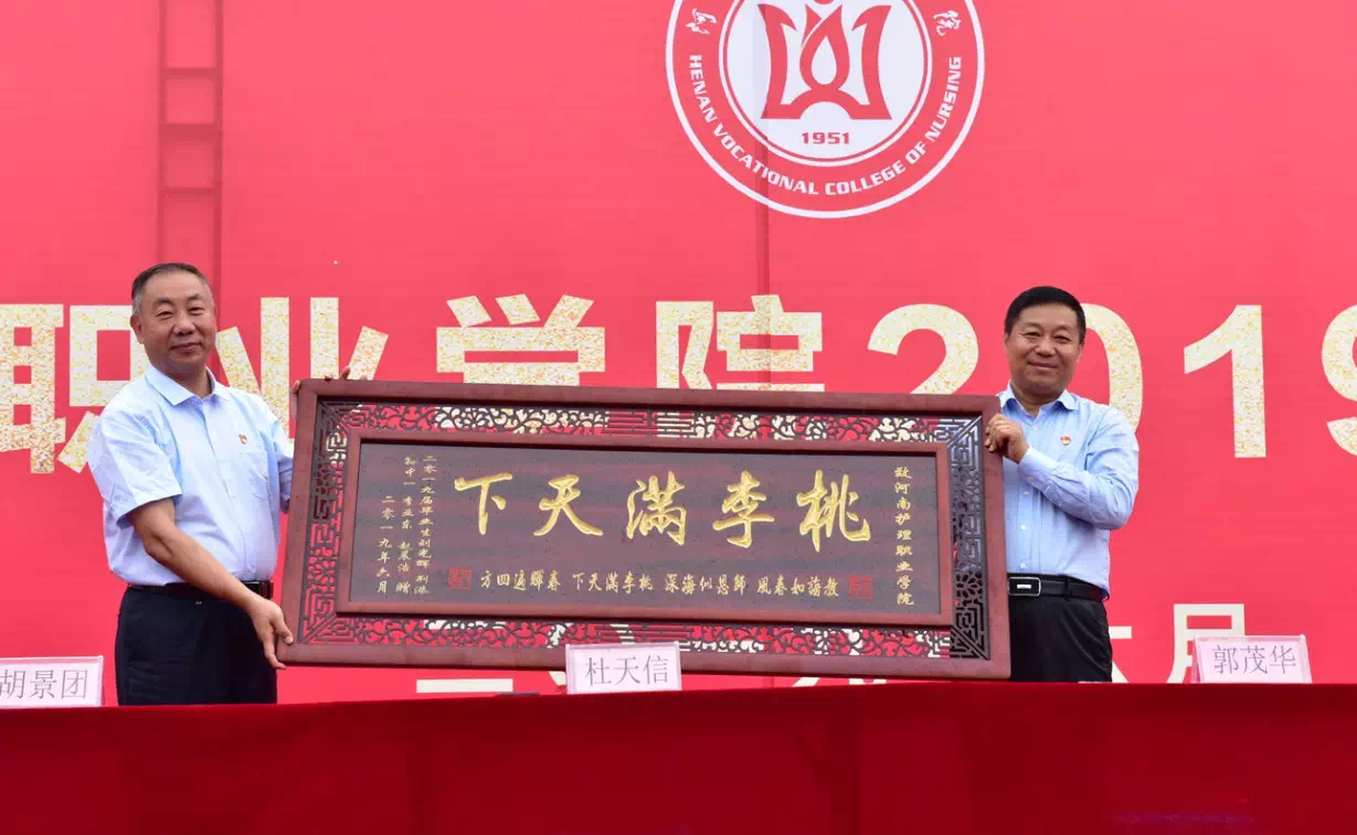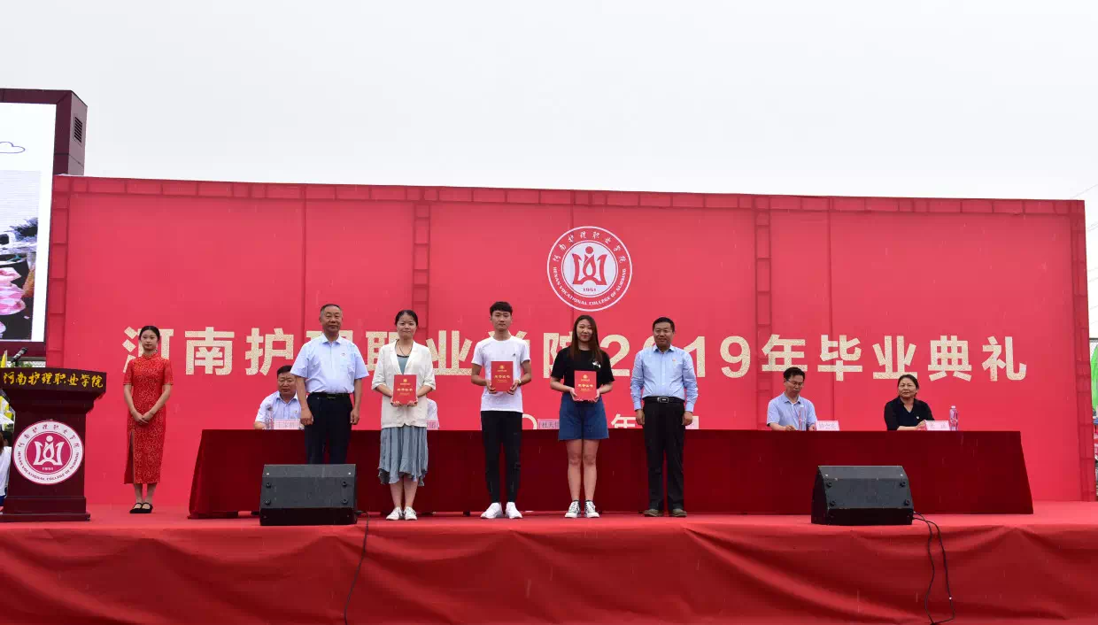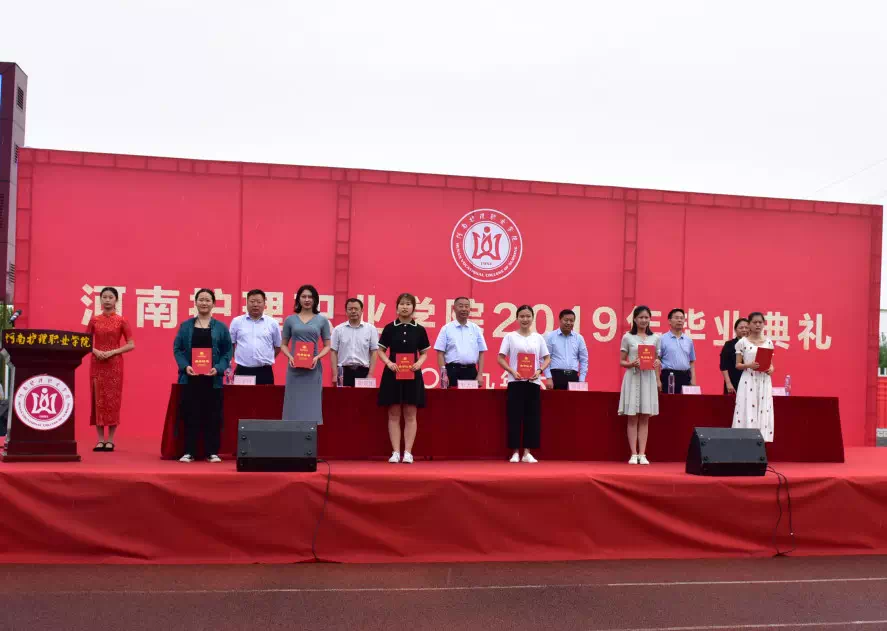 全体学院领导为荣获2019年河南省优秀大专毕业生颁发证书,为2019届毕业生代表颁发毕业证书。