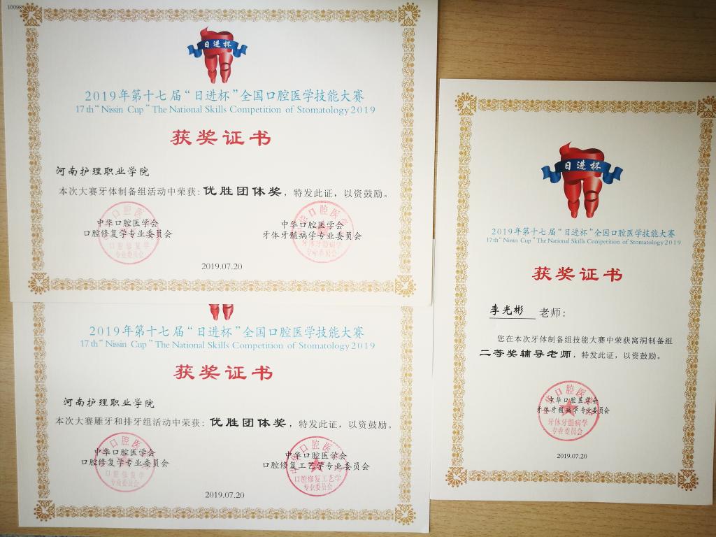 由于我院首次参加口腔医学专业组比赛,缺乏参赛及辅导经验,口腔教研室主任葛秋云及全体口腔专业教师组成竞赛辅导团队,在备赛期间,各辅导教师精诚合作,共同研究评分细则,认真拟定培训方案,组织讨论比赛内容,规范操作技能,放弃休息时间,全力以赴,悉心指导,一分一分地抠细节,提成绩。同学们发扬河护精神,锲而不舍、刻苦拼搏、勇于争先,不叫苦不叫累。学院领导高度重视,院长郭茂华多次对竞赛做出指示,在资金、人员方面给予大力支持,并在参赛前安排李光彬老师带队外出参加培训,获得了宝贵的比赛信息和实战经验。欲戴王冠,必受其重!经过全体师生五个多月的备赛,在付出了超常的辛苦和努力后,功夫不负有心人,此次大赛我院硕果累累,喜报频频!