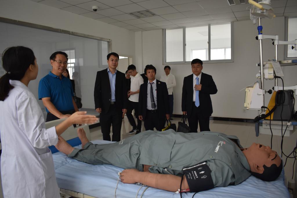 钟院长陪同来宾先后参观了学院护理实训楼、教学楼。甲斐正训一行对我院先进的实验实训设备、一流的实训条件大加称赞。在护理实训楼二楼河南省护理技能竞赛学生光荣榜前,仔细聆听了我院护理专业悠久的办学历史和深厚的办学底蕴。在综合技能考核室、心肺复苏实训室、模拟ICU病房、模拟手术室、儿科实训室里,我院先进的基础设施和优异的办学条件给甲斐正训一行留下了美好的印象。