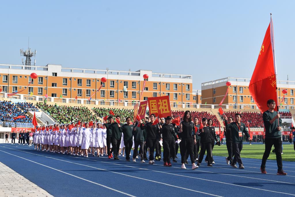 “奋进新时代,筑梦河护人”,“展河护文明风貌,迎中华人民共和国成立70周年”,他们喊着嘹亮的口号,排着整齐的队伍,迈着矫健的步伐,展现出我院师生充满自信、奋发进取、积极向上的良好精神风貌,80名白衣天使身穿白色护士服,手拿小红旗,经过主席台迅速变换队形,形成创意数字“70”,集体为新中国七十华诞献上自己最美好的祝愿,赢得了现场观众的阵阵掌声。