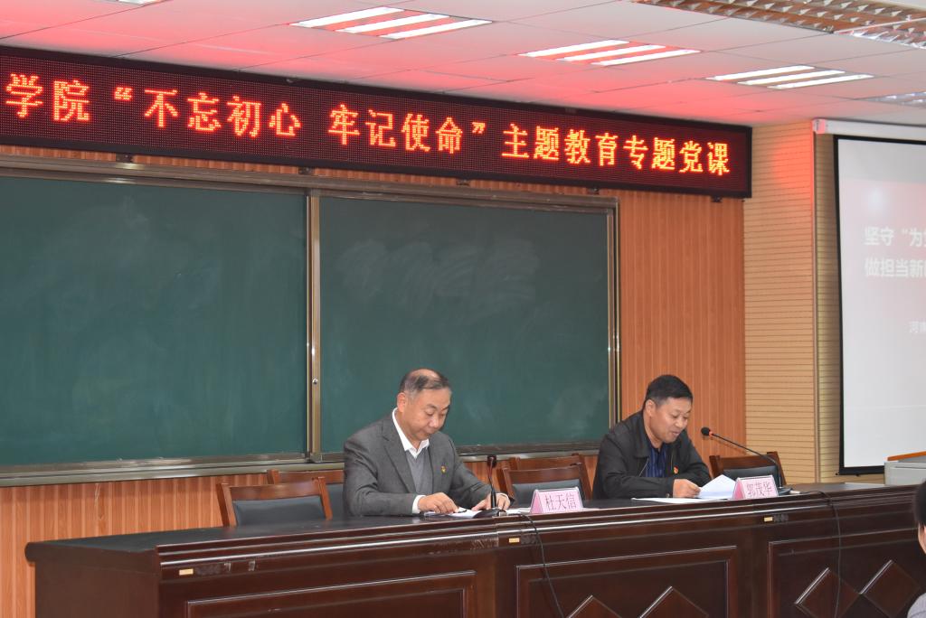 按照省委、省委高校工委关于“不忘初心、牢记使命”主题教育讲好专题党课的有关要求,10月16日下午,我院在基础实训楼B303举办“不忘初心、牢记使命”主题教育专题党课,学院党委书记杜天信为党员干部讲授题为“‘坚守为党育人、为国育才’初心和使命做担当新时期学院建设发展重任的好干部”专题党课。省委高校工委第三巡回指导组组长丁松林、副组长李志宏、组员贾海波、杨延杰莅临学院指导,学院领导、副科级以上干部、党员代表参加会议。会议由党委副书记、院长郭茂华主持。