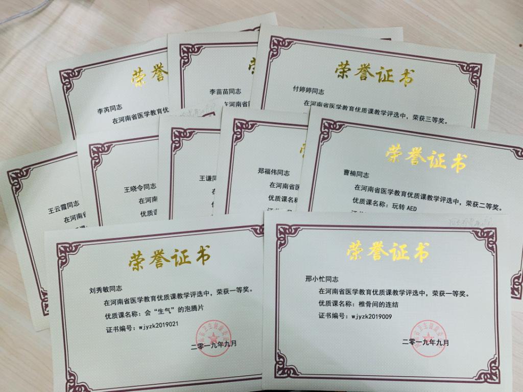 在近期举行的2019年河南省医学教育优质课教学评选活动中,代表我院参赛的11名青年教师全部获奖!