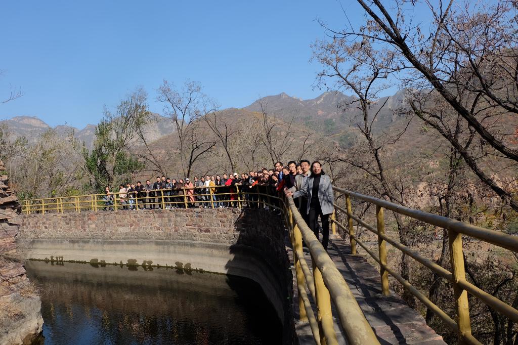 大家沿着依山而建的渠道参观了红旗渠总干渠的咽喉工程——青年洞,走在紧贴着山崖凌空而建的栈道上,看着穿山而过的红旗渠水,再次感受了“愚公奋起十春秋,引来漳河润田禾”的艰辛和不易,实地见证了红旗渠工程的伟大。大家被当年林县人民不屈不挠的革命斗志和战天斗地的英雄气概深深感动,不由自主自发地合唱起了《团结就是力量》和《我和我的祖国》这两首振奋人心的歌曲,歌声久久回荡在幽静的山谷间,鼓舞着广大党员鼓足干劲再出发,认真学习、努力工作、热爱生活,为祖国发展贡献自己的智慧和力量!