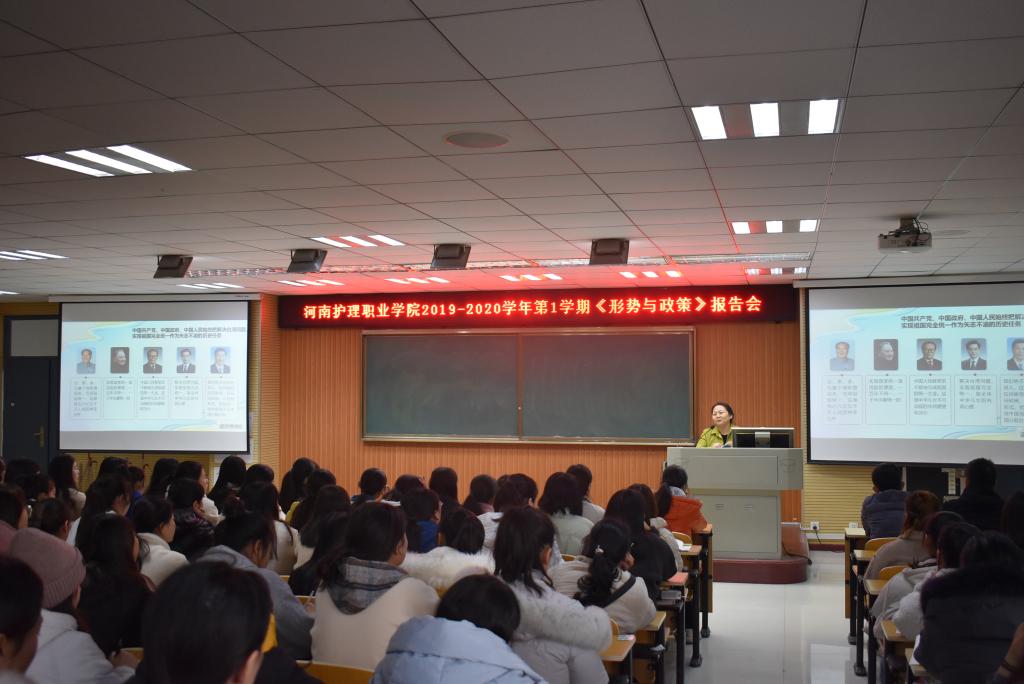 11月28日下午4:00,我院2019-2020学年第一学期第10期“形势与政策专题讲座”在基础楼报告厅举行,2019级大专护理专业部分学生和思政部教师代表共200余人参加了讲座。
