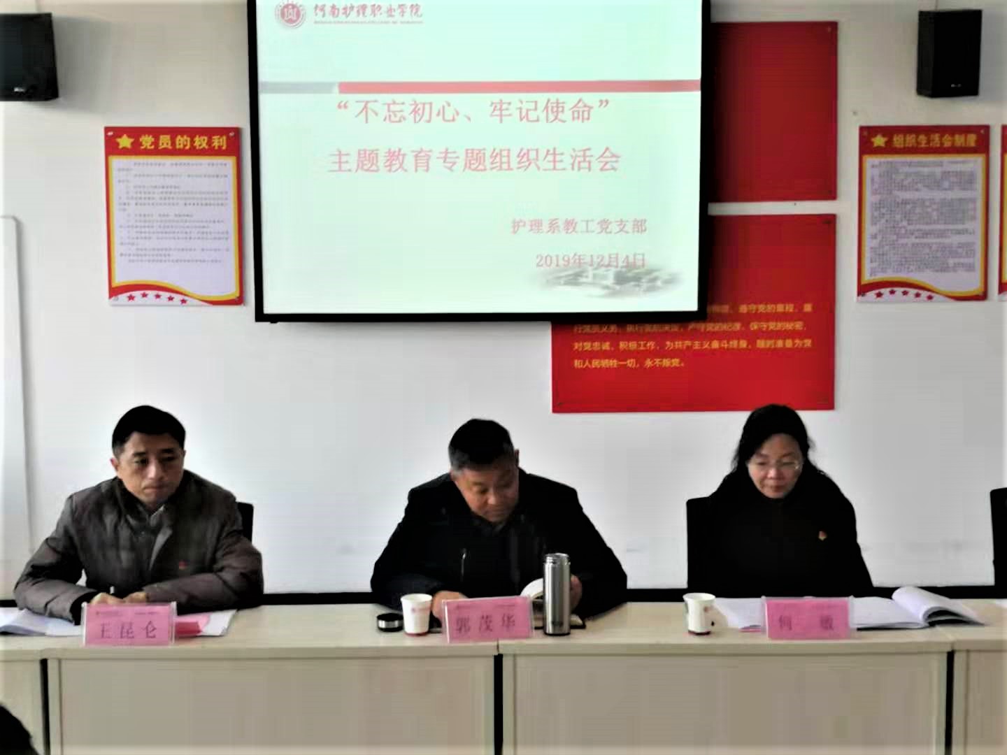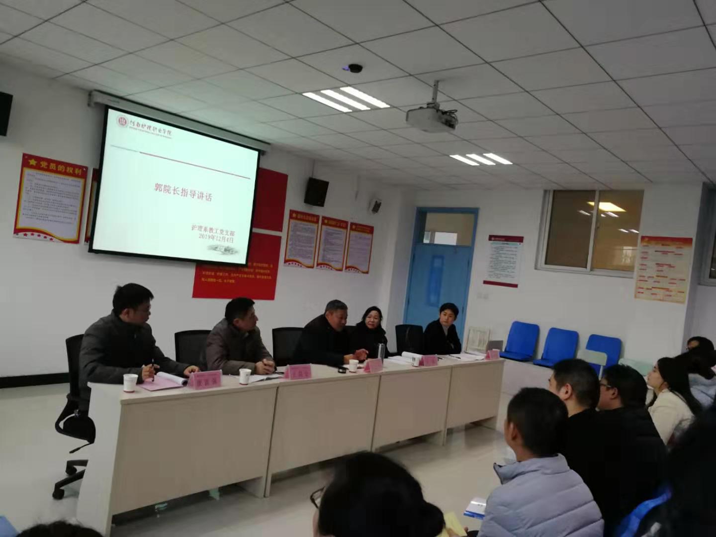 根据学院《关于印发<“不忘初心、牢记使命”主题教育专题组织生活会实施方案>的通知》精神,12月4日下午,护理系教工党支部在护理实训楼211党员活动室,召开了“不忘初心、牢记使命”主题教育专题组织生活会。院长郭茂华到会指导,护理系党总支书记王昆仑及护理系教工党支部全体教师党员参加了组织生活会。会议由护理系教工党支部书记骆焕丽主持。