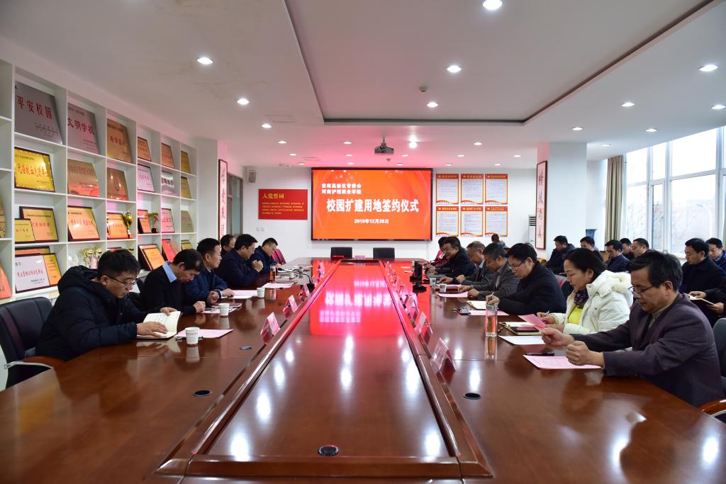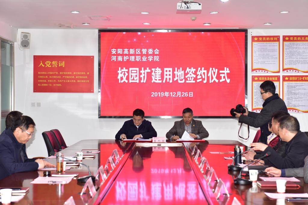 12月26日下午,安阳市文峰区政府、高新区管委会与河南护理学院校园扩建用地签约仪式在学院第一会议室成功举行。文峰区区长、高新区管委会主任崔元锋,高新区党工委副书记、副主任牛福生,高新区党工委委员、副主任刘振修,高新区招商局局长薛建军、建设局副局长田建滨、商颂办事处书记马志强,学院党委书记杜天信,院长郭茂华,党委副书记、工会主席胡景团,副院长钟会亮,副院长王家桥,纪委书记张远,濮阳市安阳地区医院党委书记李豫秋,院长刘金榜共同出席签约仪式。签约仪式由学院党委副书记、工会主席胡景团主持。