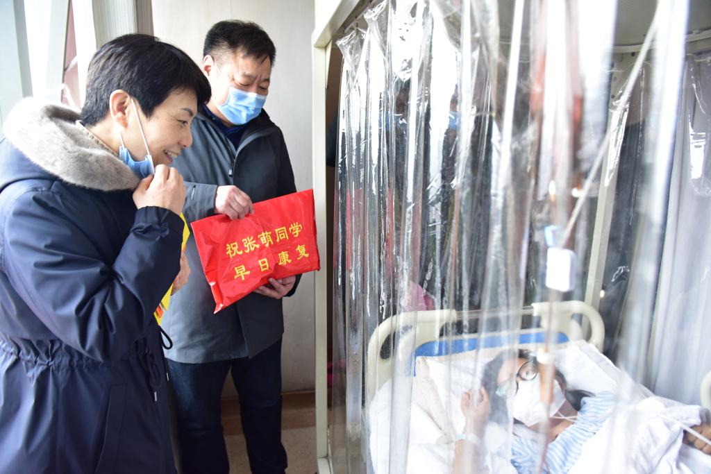 1月7日,副院长王家桥和学生处处长李艳芳赴郑州大学第一附属医院代表全院师生将捐款亲手交给了张萌同学,并鼓励张萌同学要坚定战胜病魔的信心,积极治疗,早日康复。张萌同学非常感谢学院的关怀,学院的善举在自己和家人最艰难困苦的时候送来了温暖和希望。看到学院领导在百忙之中到病房探望自己及家人,张萌同学备受鼓舞,热泪盈眶,感谢学院的爱心捐助,使她重新拥有了生命和美好人生的希望。