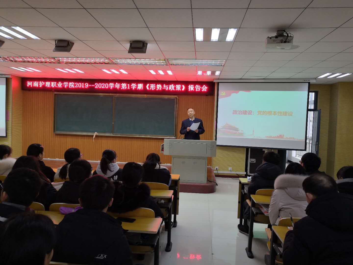 1月7日下午4:00,我院在基础楼报告厅举行2019-2020学年第1学期第18期形势与政策报告会,学院党委书记杜天信作了《政治建设:党的根本性建设》的专题报告,19级大专检验和医学营养专业学生代表200余人现场聆听了此次报告。