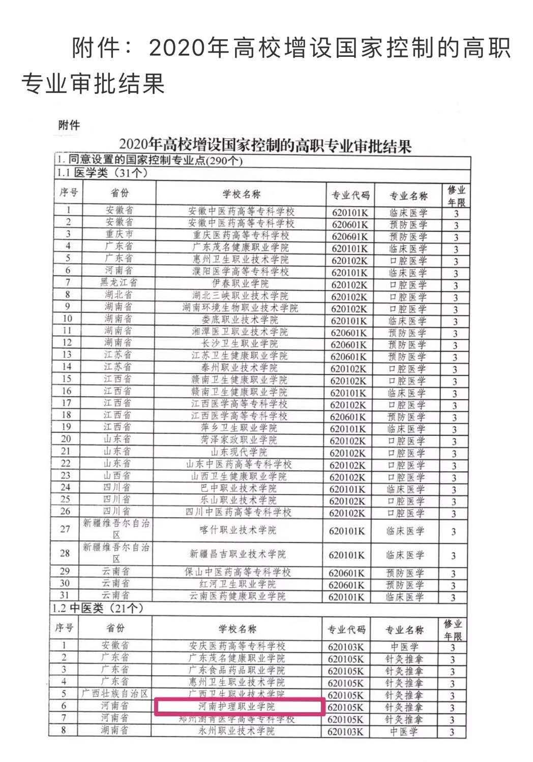近日,教育部下发《教育部关于公布2020年高等职业教育专业设置备案和审批结果的通知》(教职成函〔2020〕1号),我院申报的针灸推拿专业通过教育部审核批准,自2020年起可以招生。